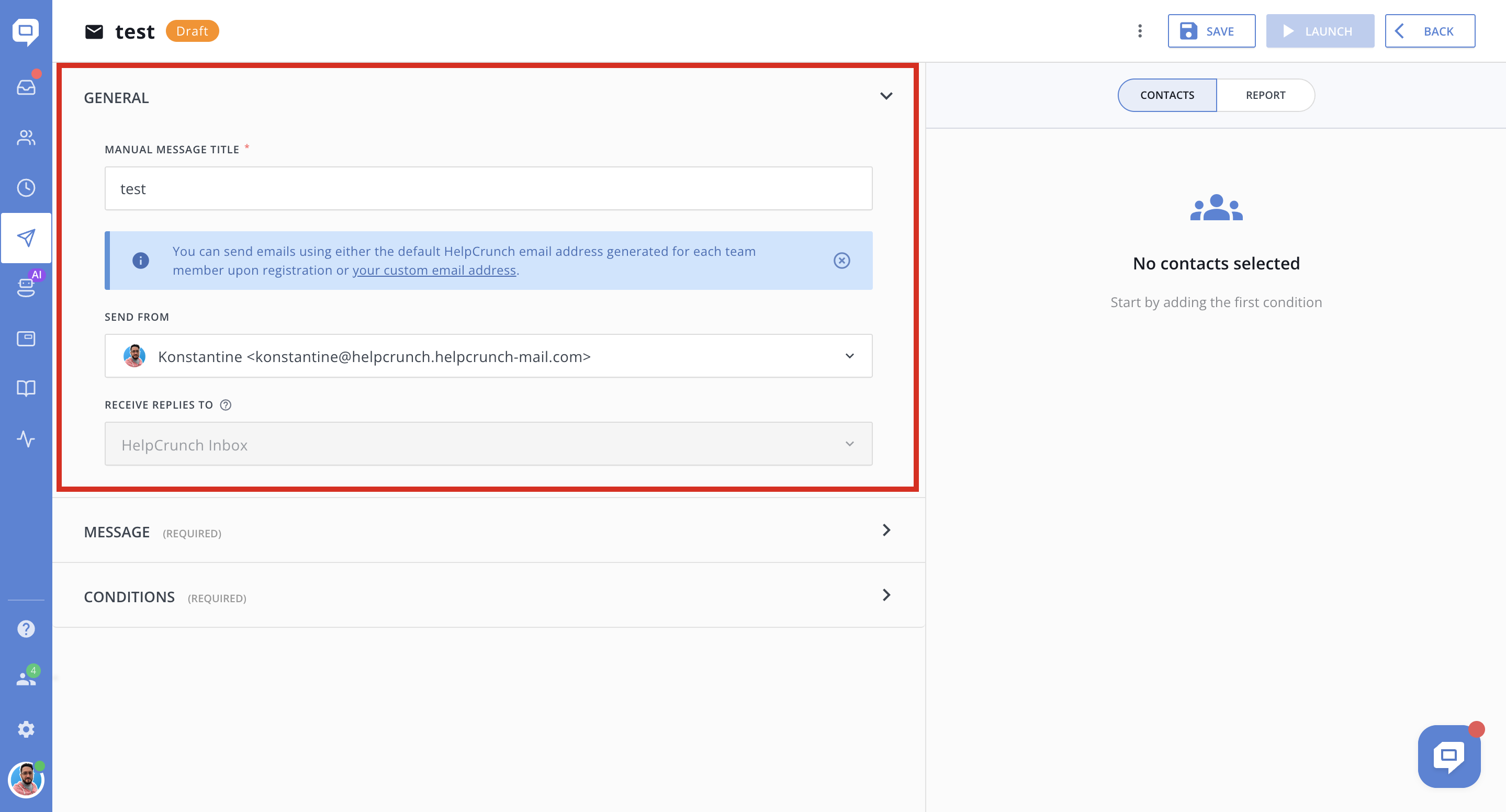 Send From: Select the sender's email address. You can choose between the default HelpCrunch-generated email for each team member or a custom email address you’ve set up.