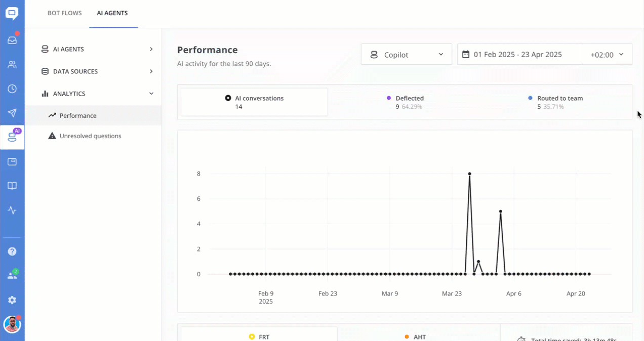 - Navigate to Chatbot→AI Agents→Analytics→Performance.