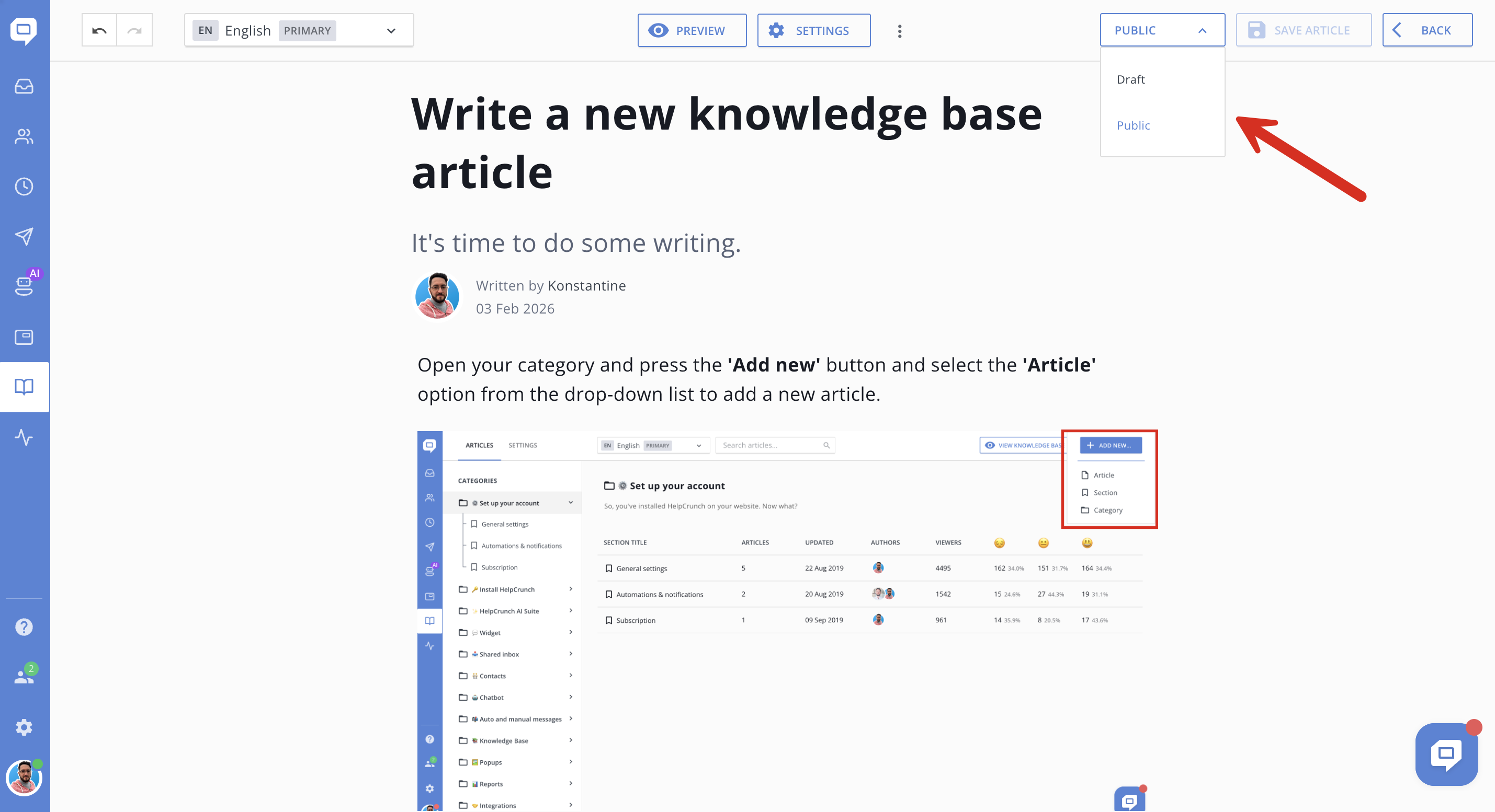 All articles are in the 'Draft' mode by default. Drafts are only visible for your team members inside your HelpCrunch dashboard.