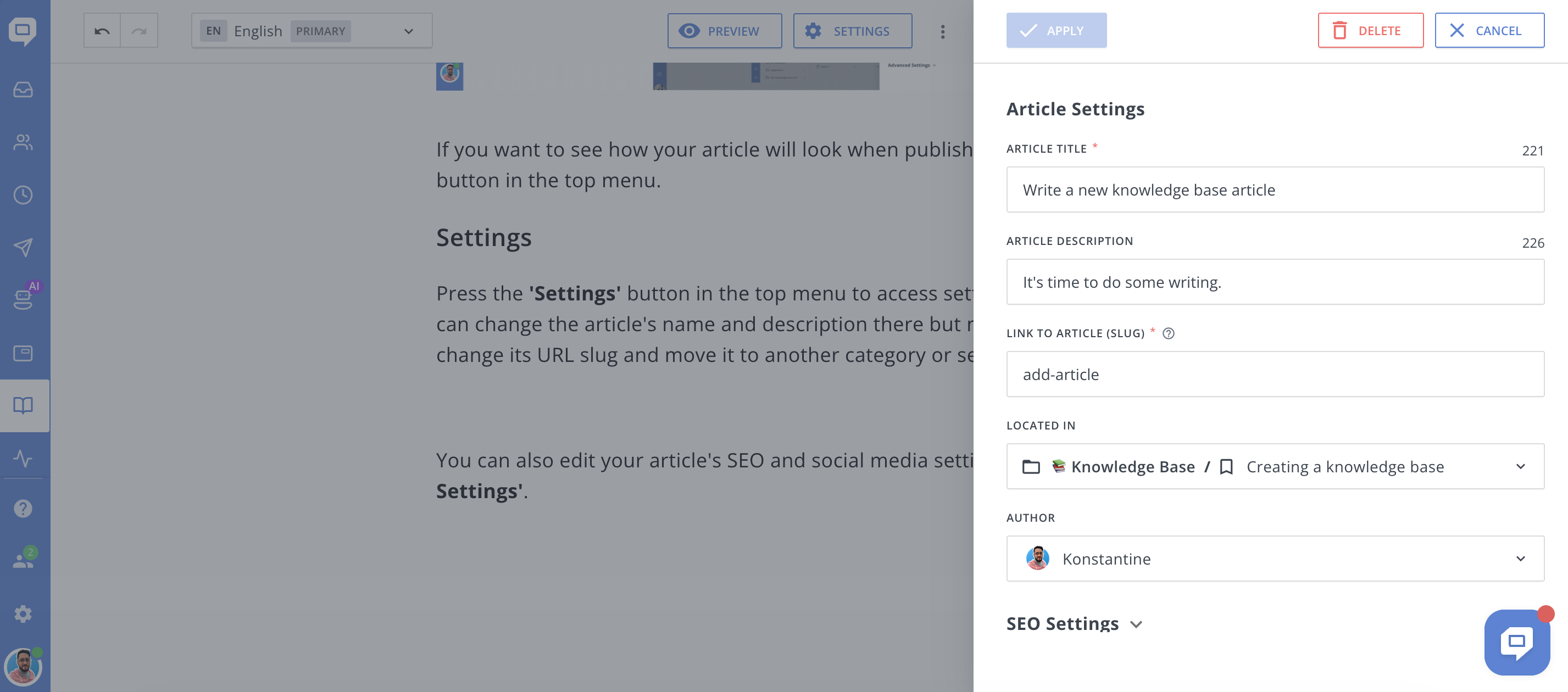 You can also edit your article's SEO and social media settings under 'Advanced Settings'.