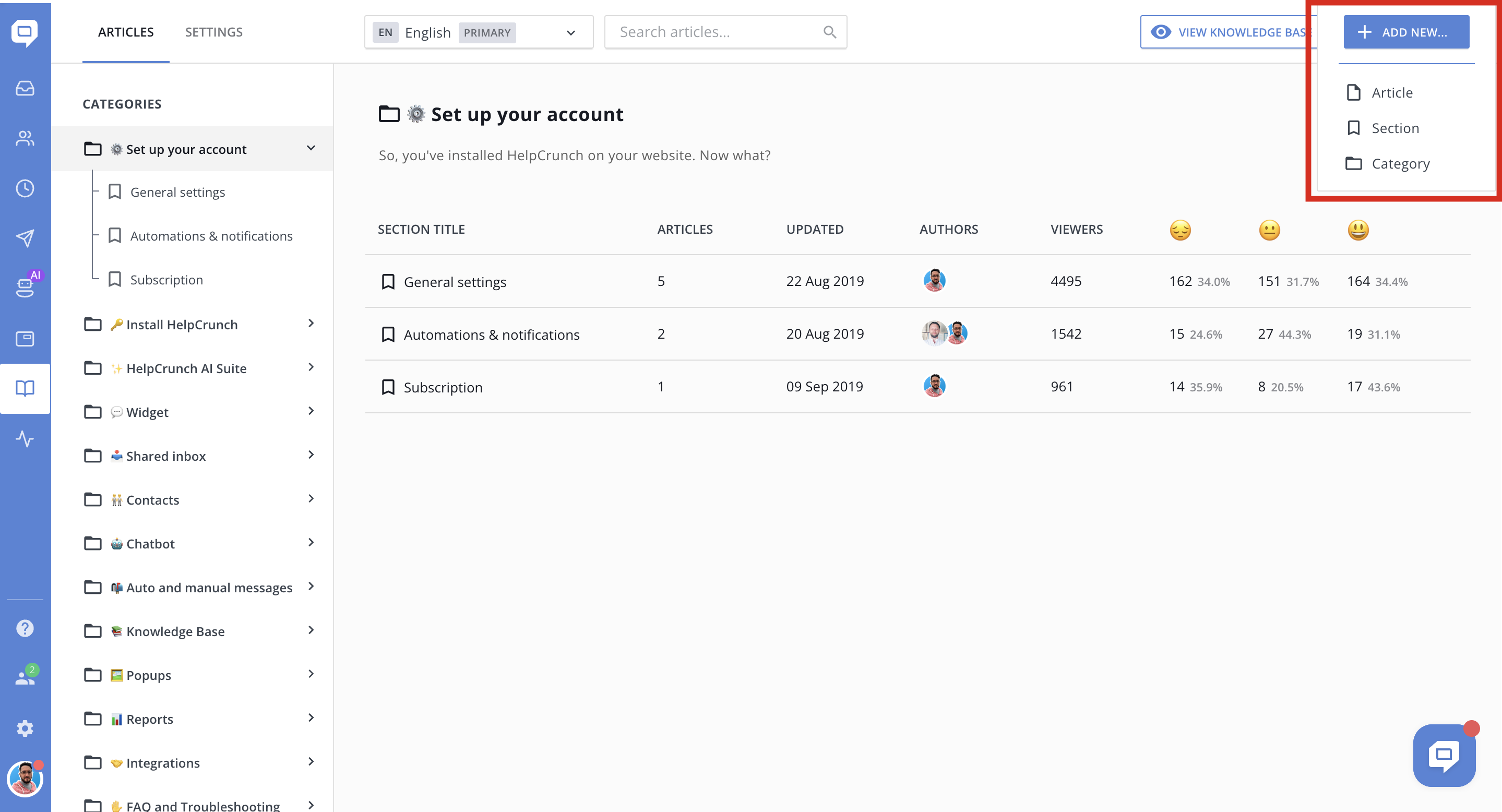 Open your category and press the 'Add new' button and select the 'Article' option from the drop-down list to add a new article.