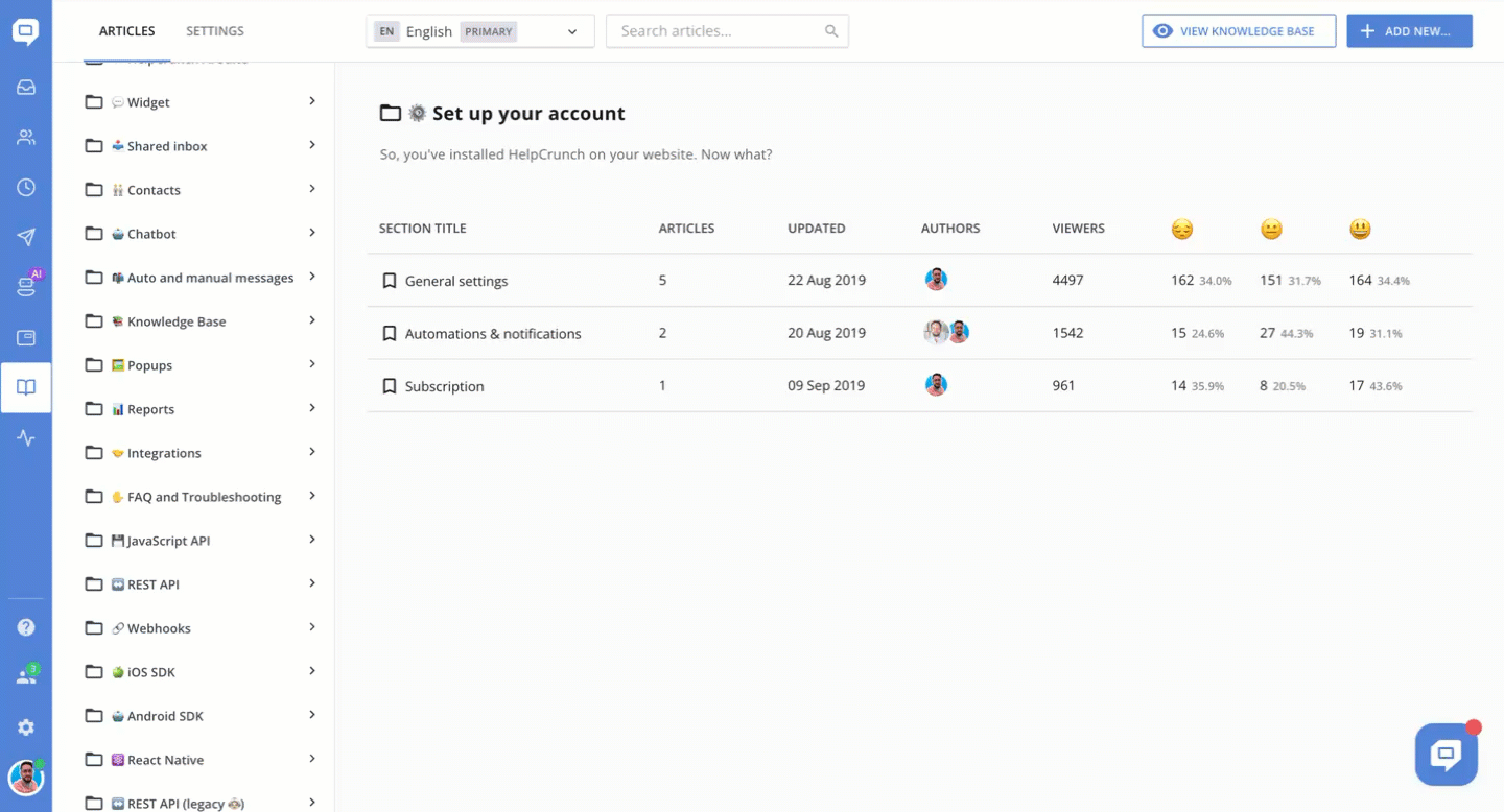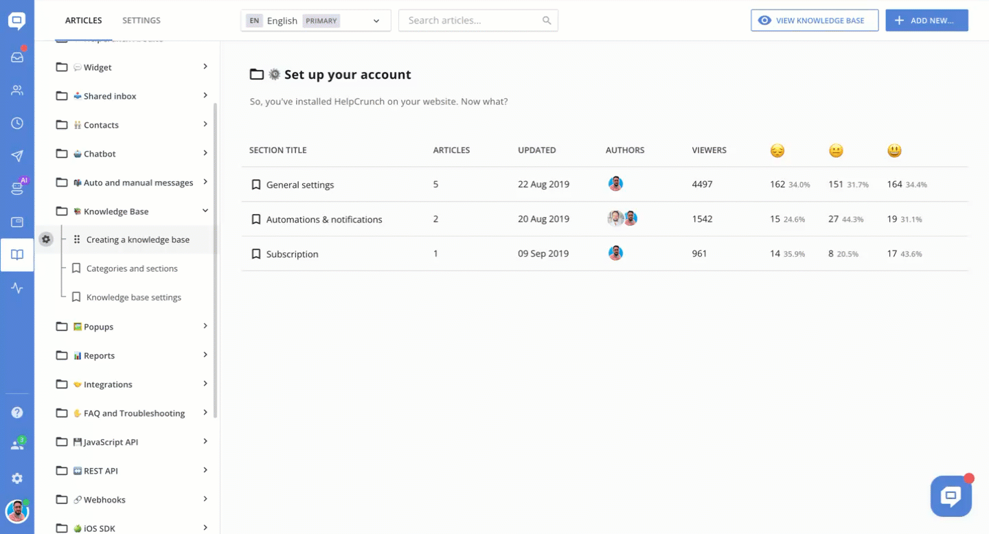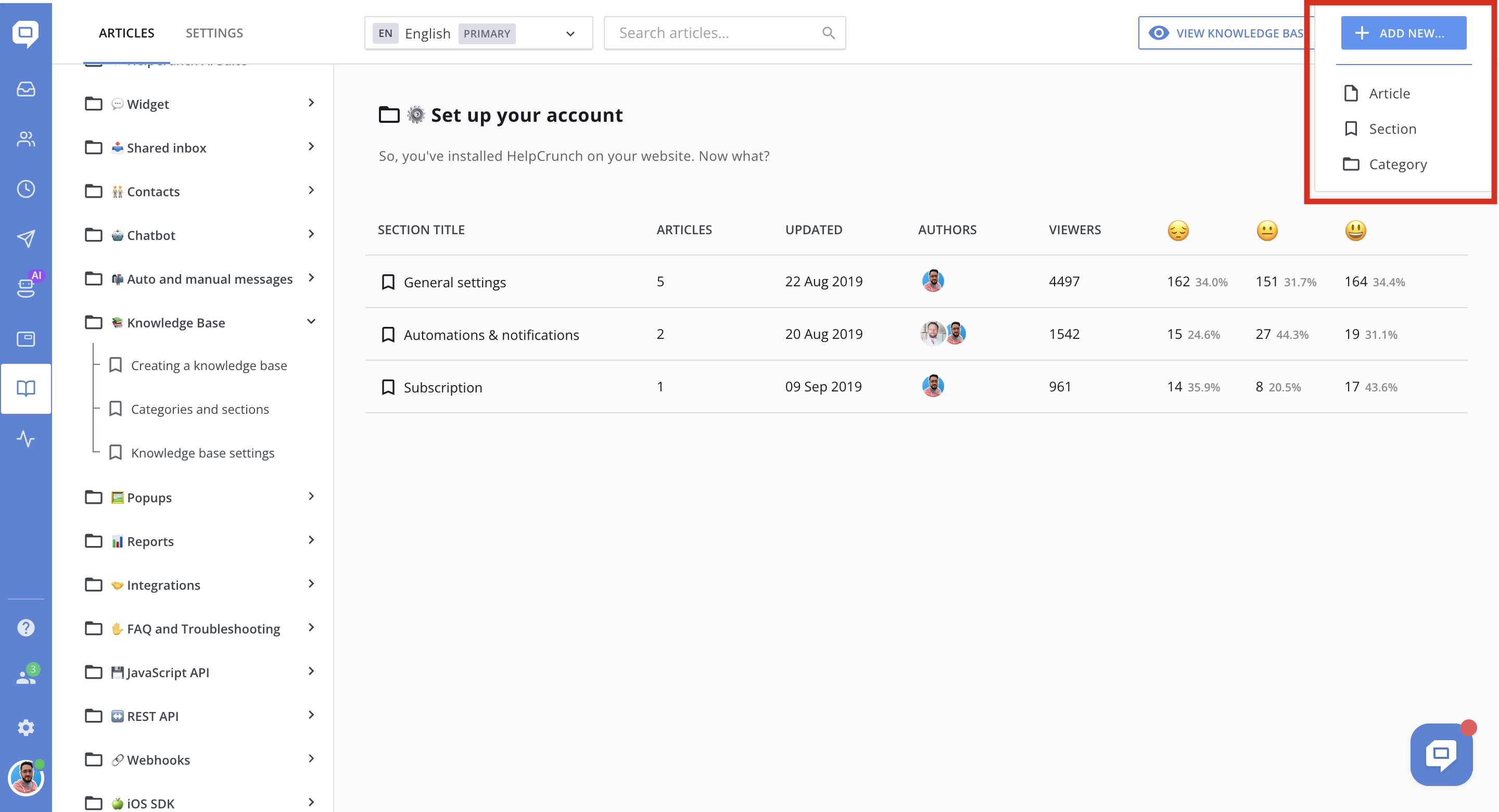 There are a couple of ways to quickly organize categories and sections in your knowledge base. First of all, you can move sections around by drag-and-dropping them in the knowledge base sidebar.