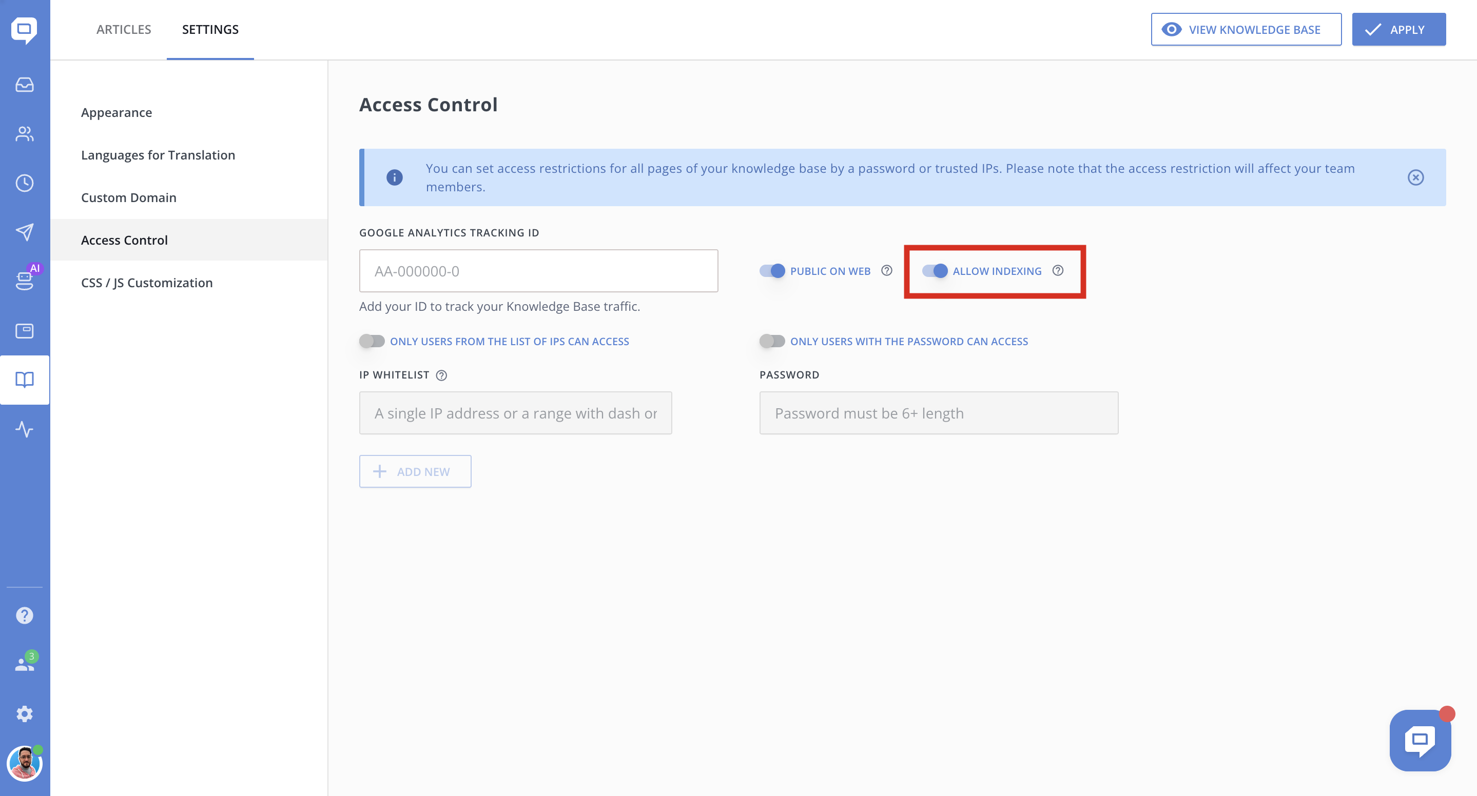 This toggle controls whether search engines (Google, Bing, etc.) are allowed to index your Knowledge Base pages.