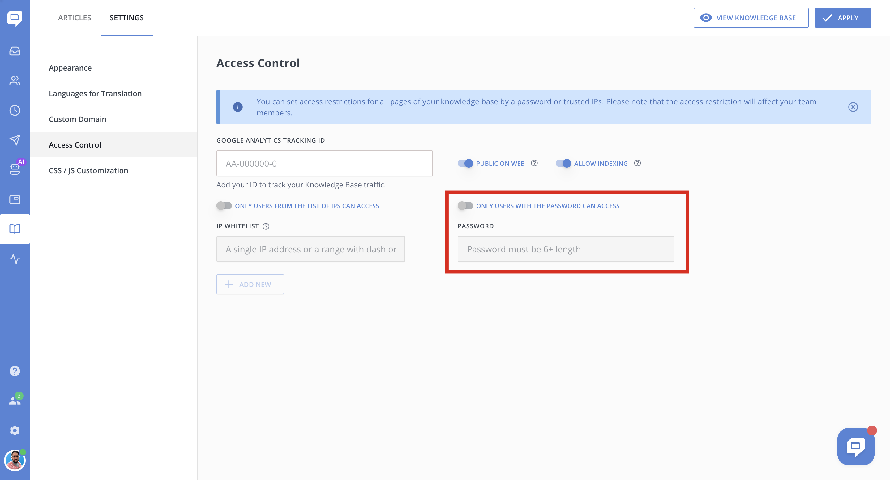 In Knowledge base Settings → General→ Access control section you can manage who can view your Knowledge Base, how it’s indexed by search engines, and how traffic is analysed. These settings apply to all pages of your Knowledge Base and affect both visitors and your internal team members.