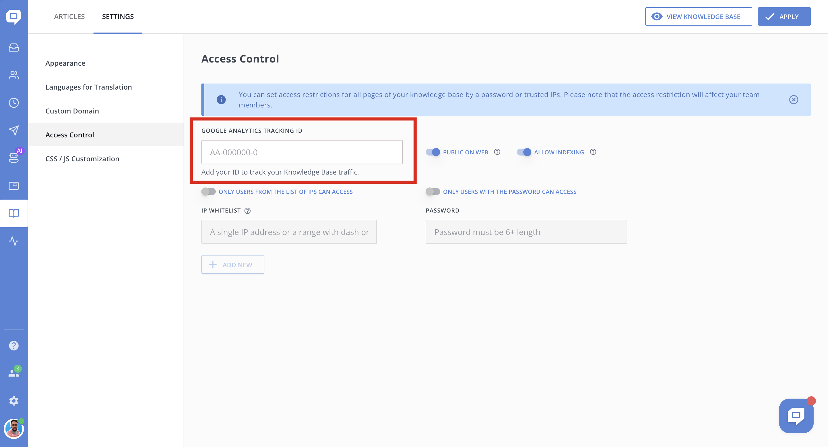 Allows you to connect Google Analytics to your Knowledge Base and track visitor activity.