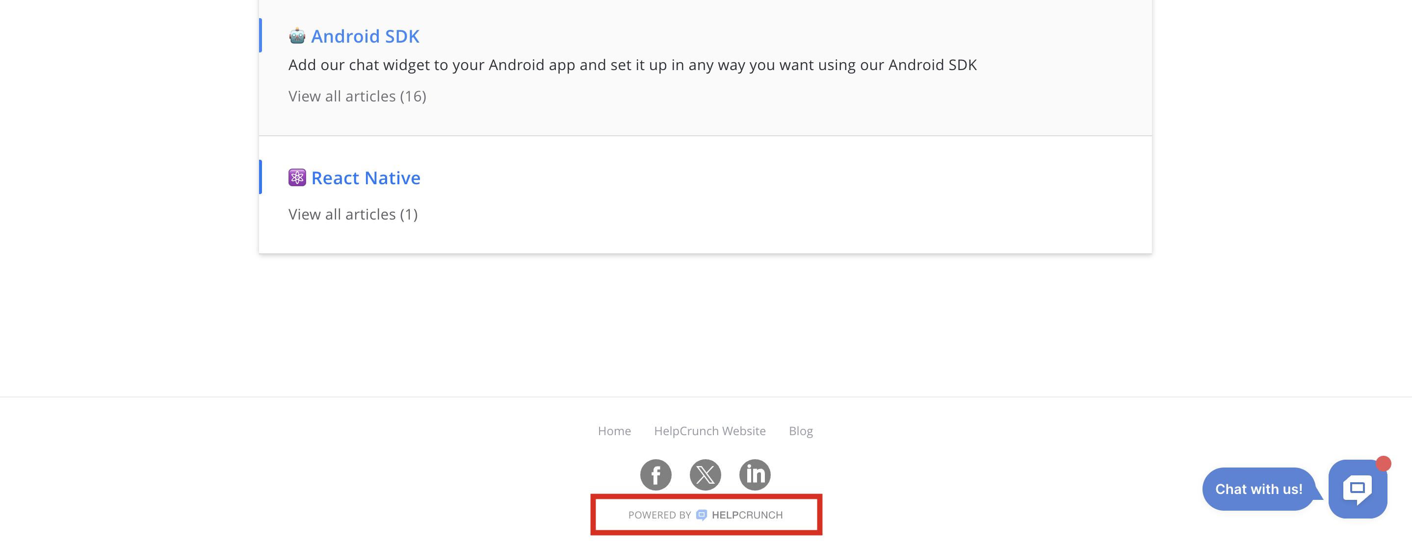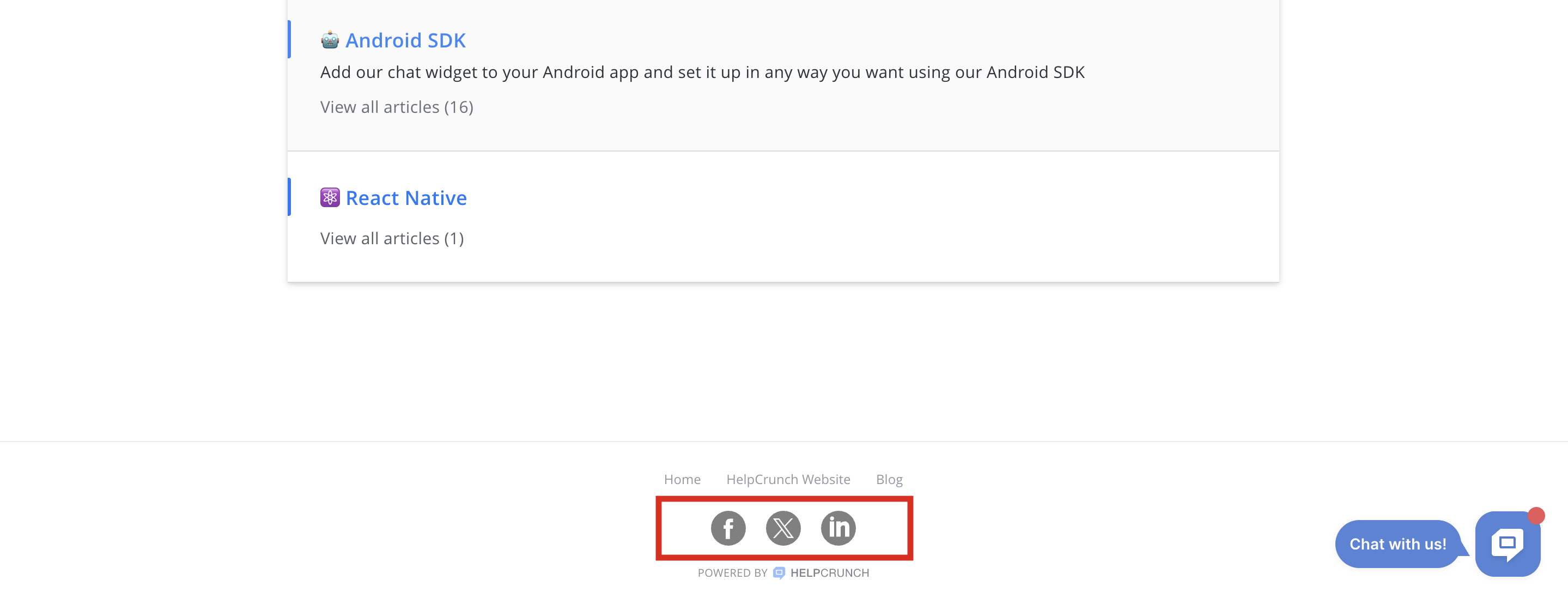 These links are displayed in the Knowledge Base footer and help users find your company on social platforms (Facebook, Twitter/X, LinkedIn).