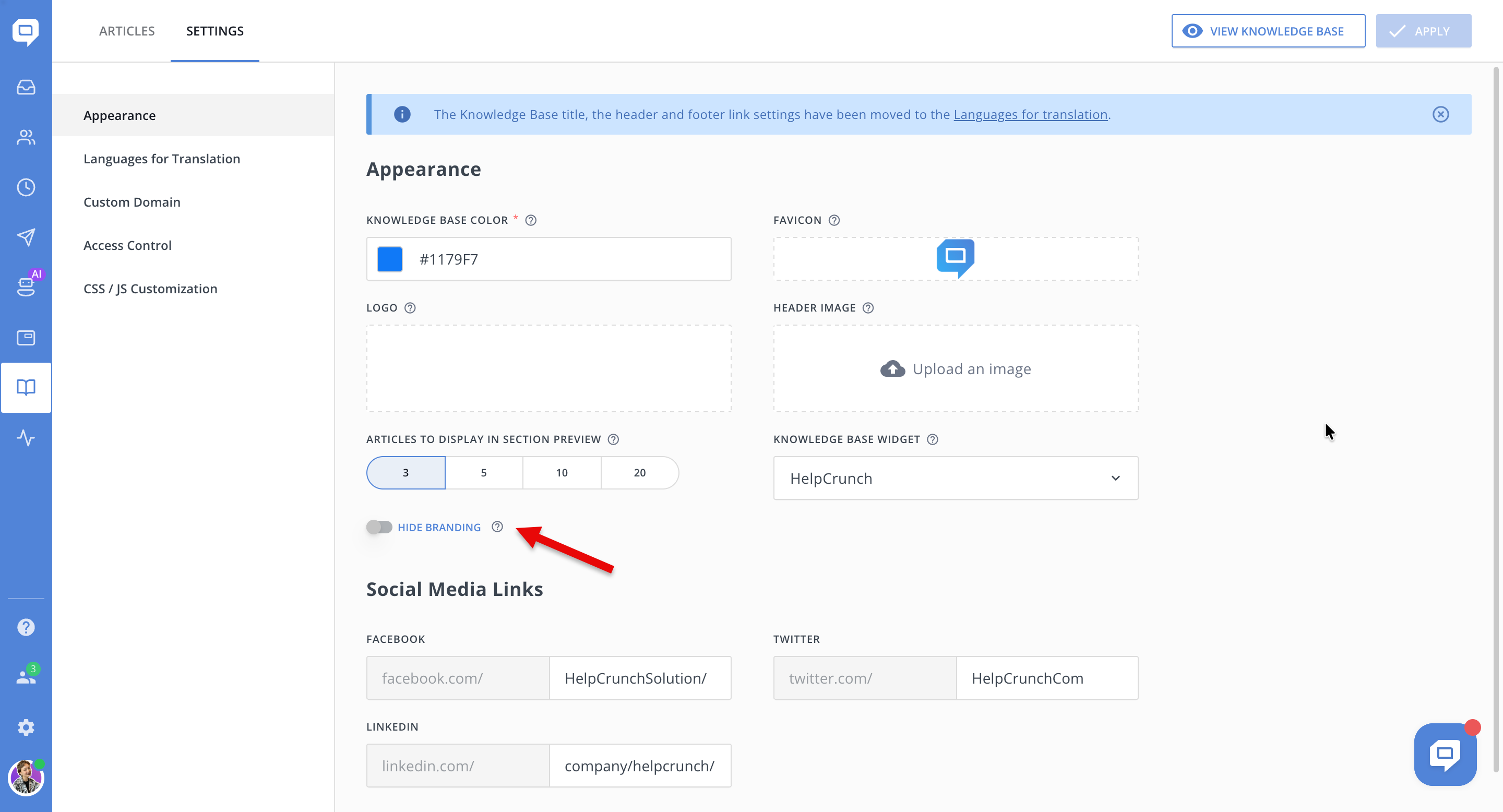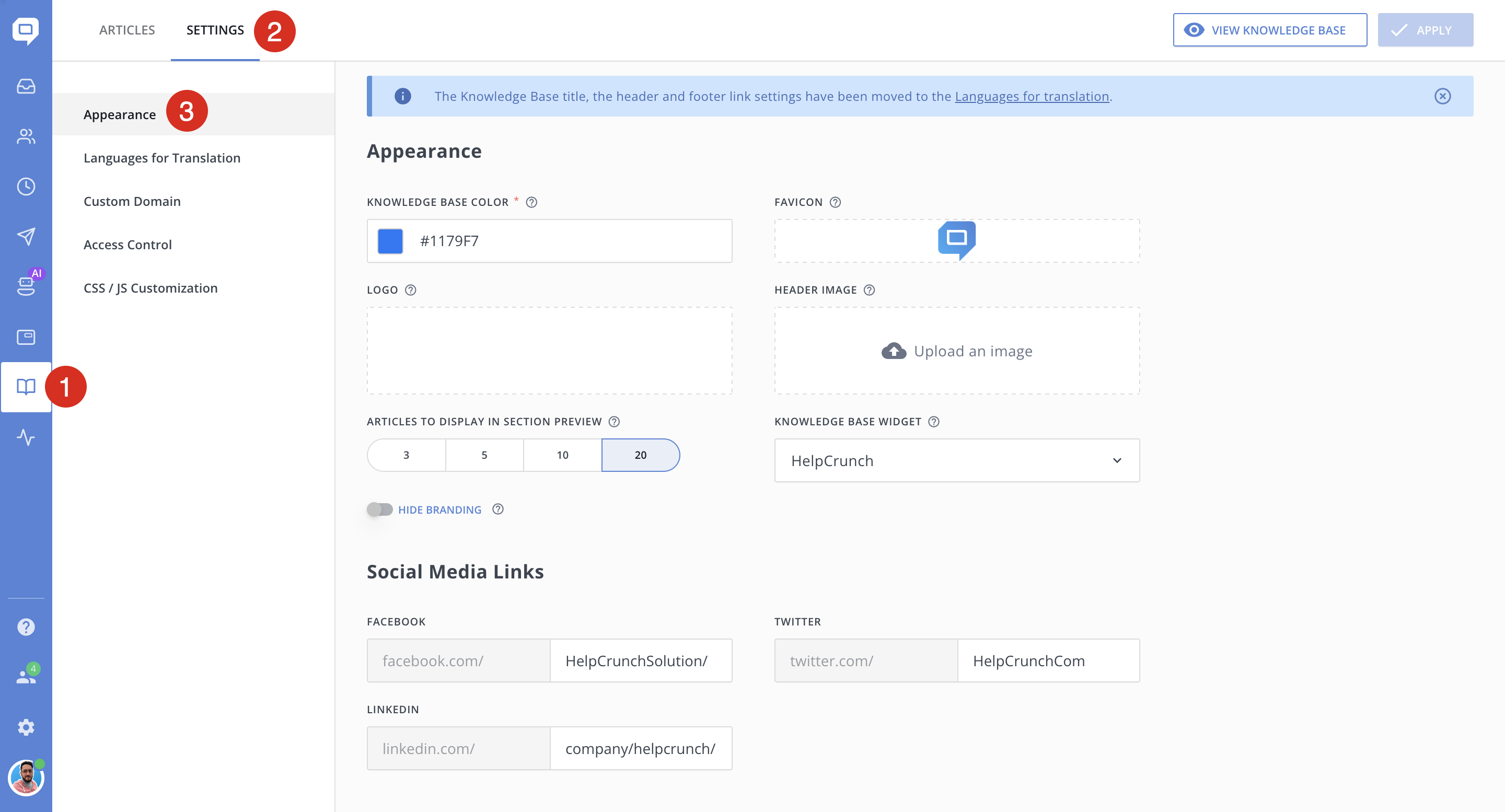 The Appearance section in Knowledge Base Settings lets you control how your Knowledge Base looks and how it’s visually integrated with your brand. These settings affect colors, branding elements, layout density, widget connection, and social links shown to visitors.
