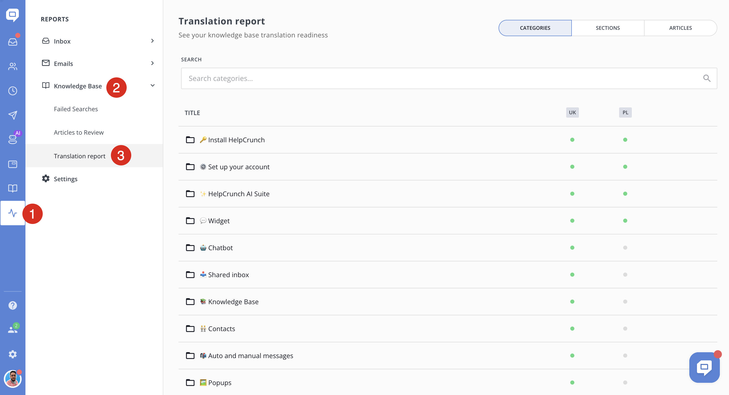 The Translation report helps you monitor how complete your Knowledge Base is across different languages. It provides a clear overview of which categories, sections, and articles are translated - and which still require attention.
