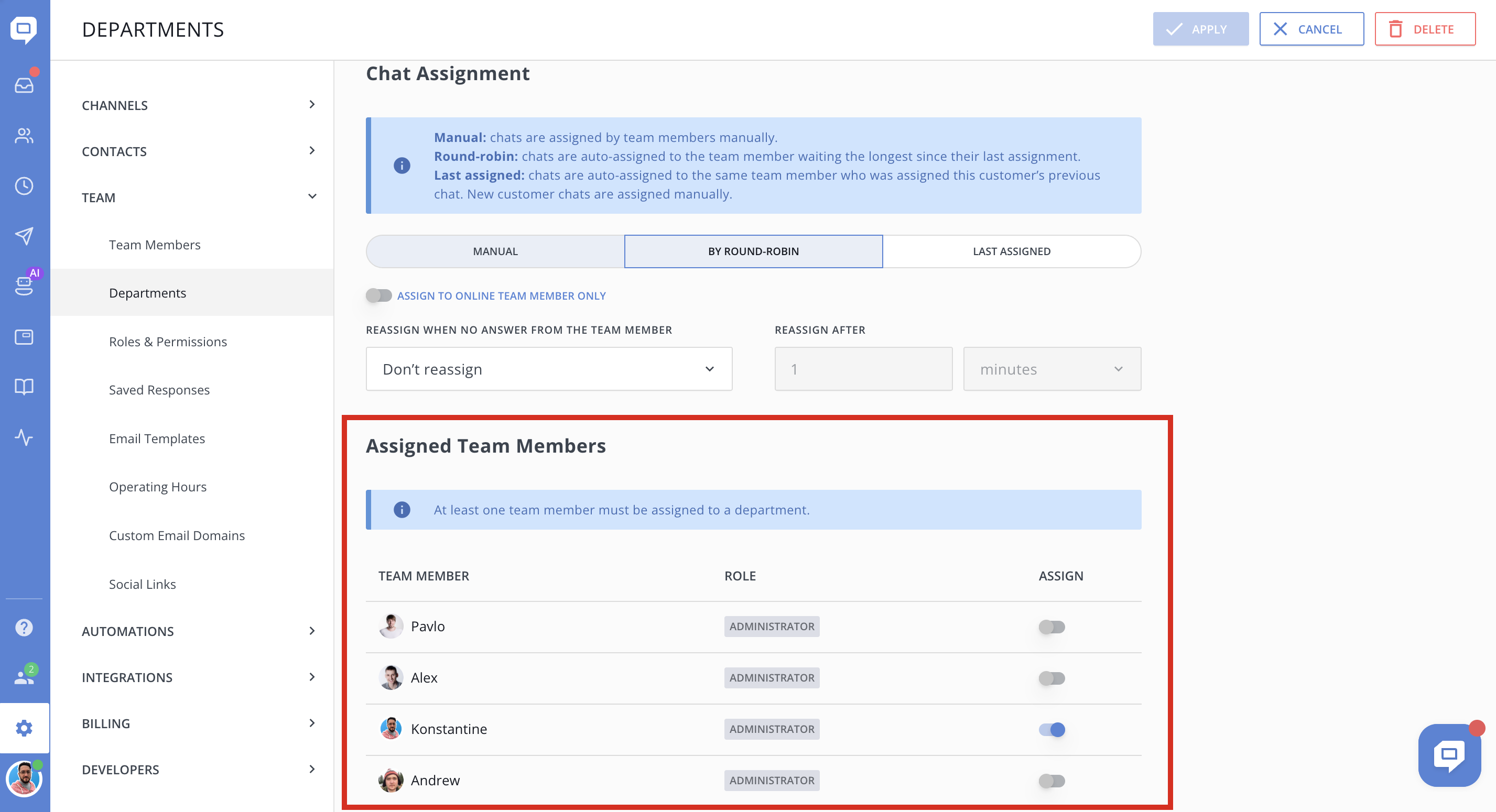 If you want to assign a chat to a certain department, you can do that right from your chat window.