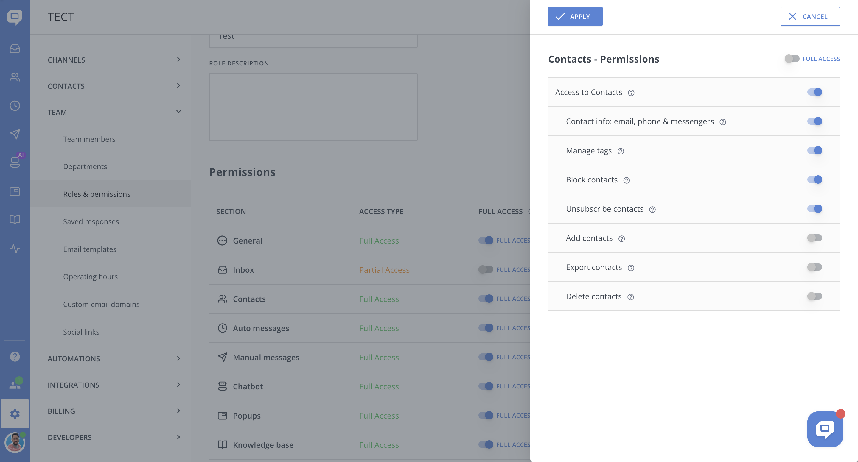 - Support - the most restrictive role, offering partial access to the inbox (unable to delete chats), contacts (cannot export or delete), and account settings (excluded from viewing and managing account preferences and email settings, but can adjust notification settings).