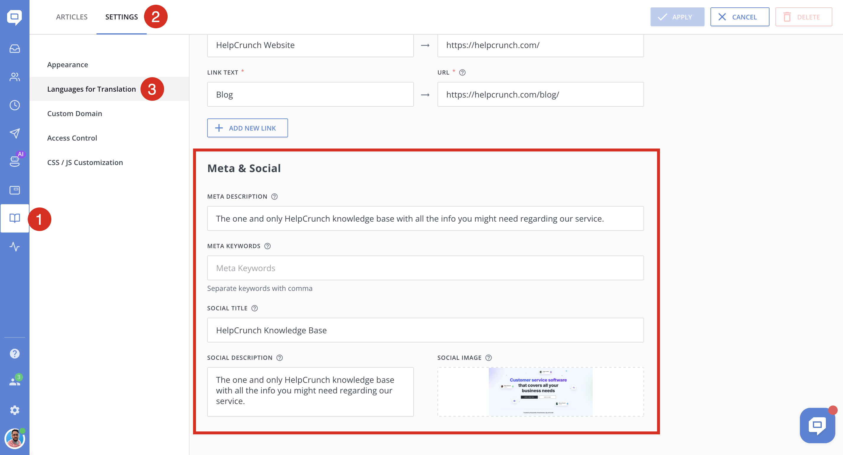 HelpCrunch Knowledge Base is highly SEO-friendly and provides advanced optimization options at every stage.