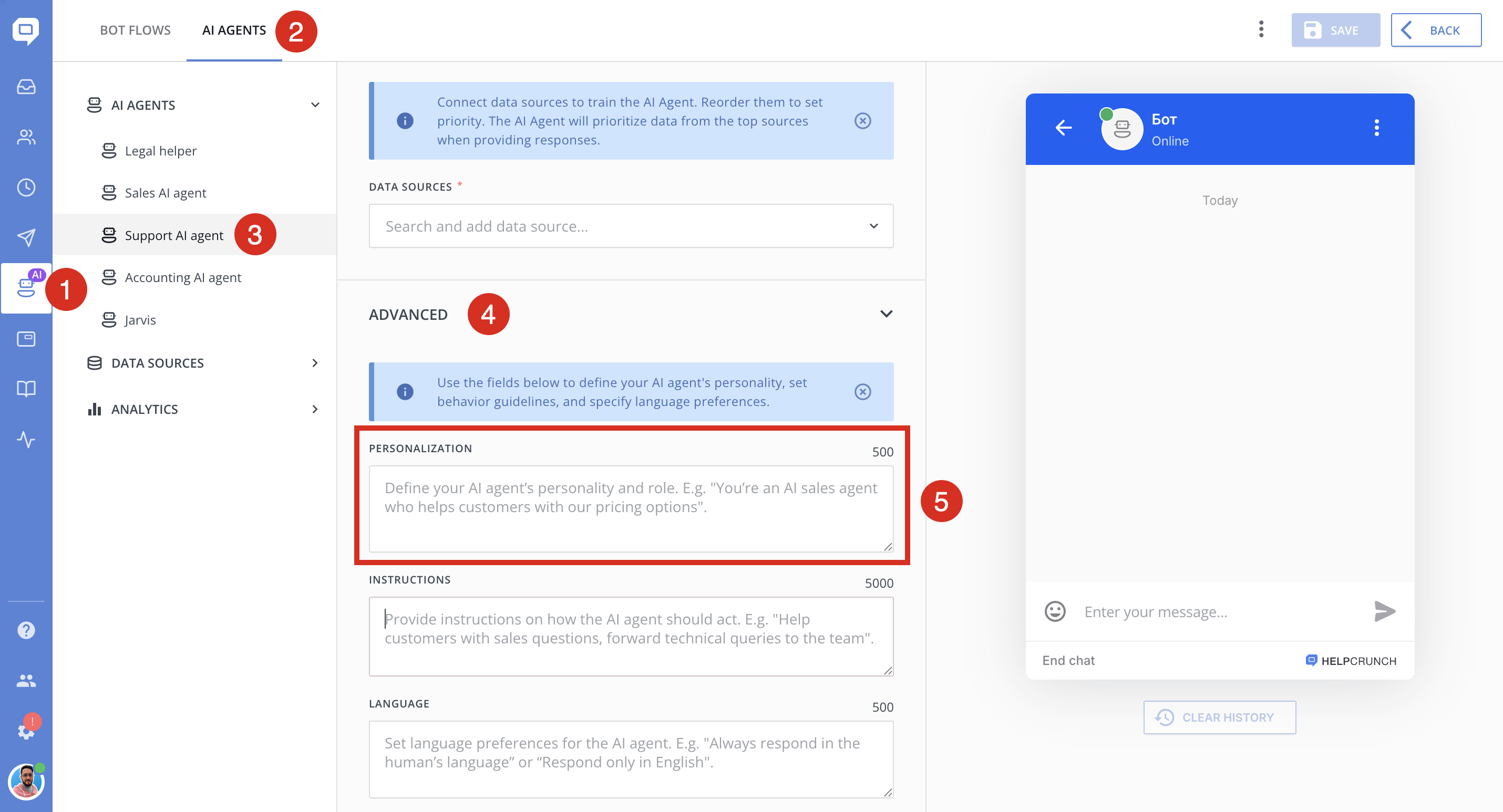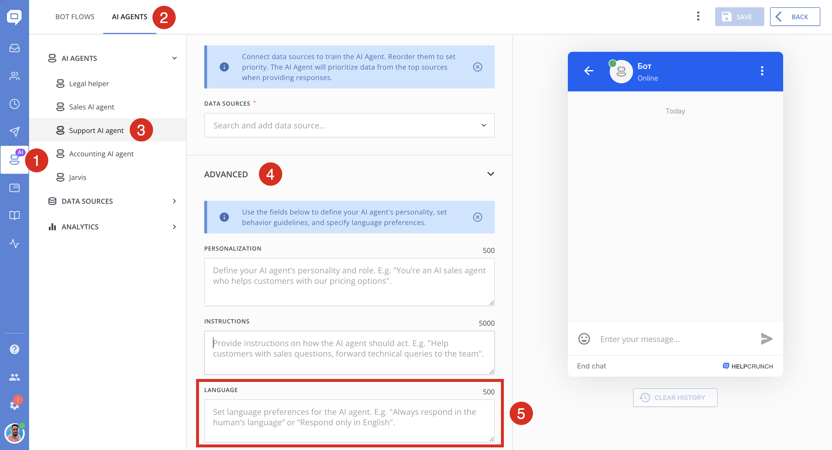- This tool searches across everything you connected to the agent (e.g., your HelpCrunch Knowledge Base + custom answers).