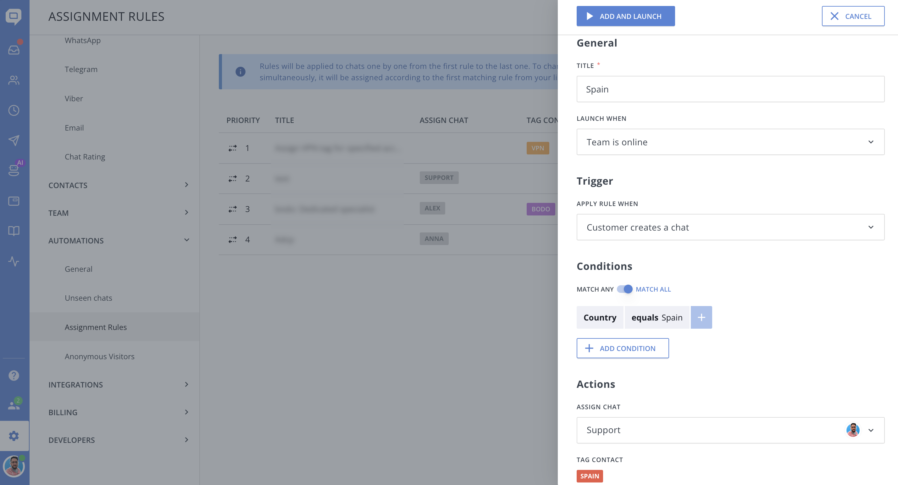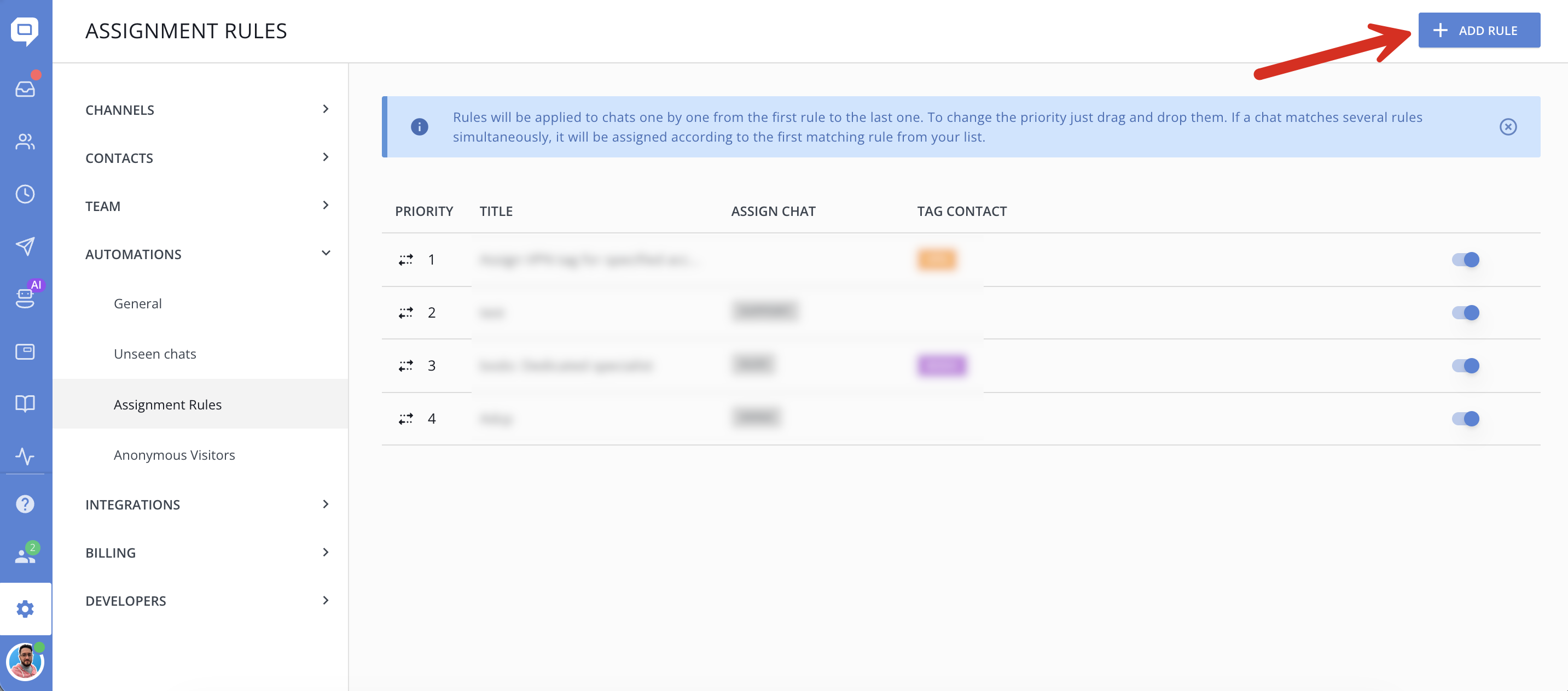 To create a new assignment rule, go to Setting → Automations → Assignment Rules and click 'Add rule':