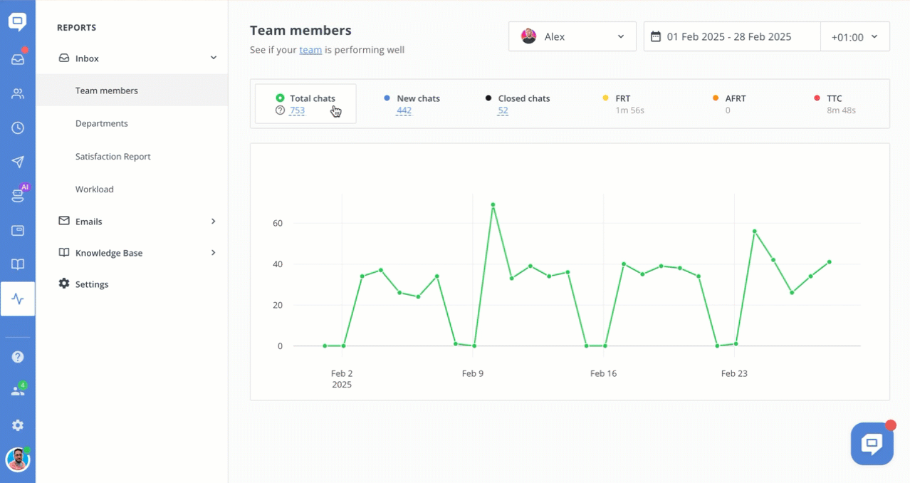 Total Chats – Total number of conversations you had in the selected period. Includes all chats where at least one reply from you or your teammates was sent to the visitor/customer.