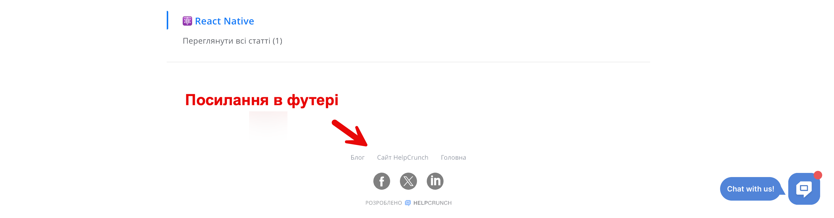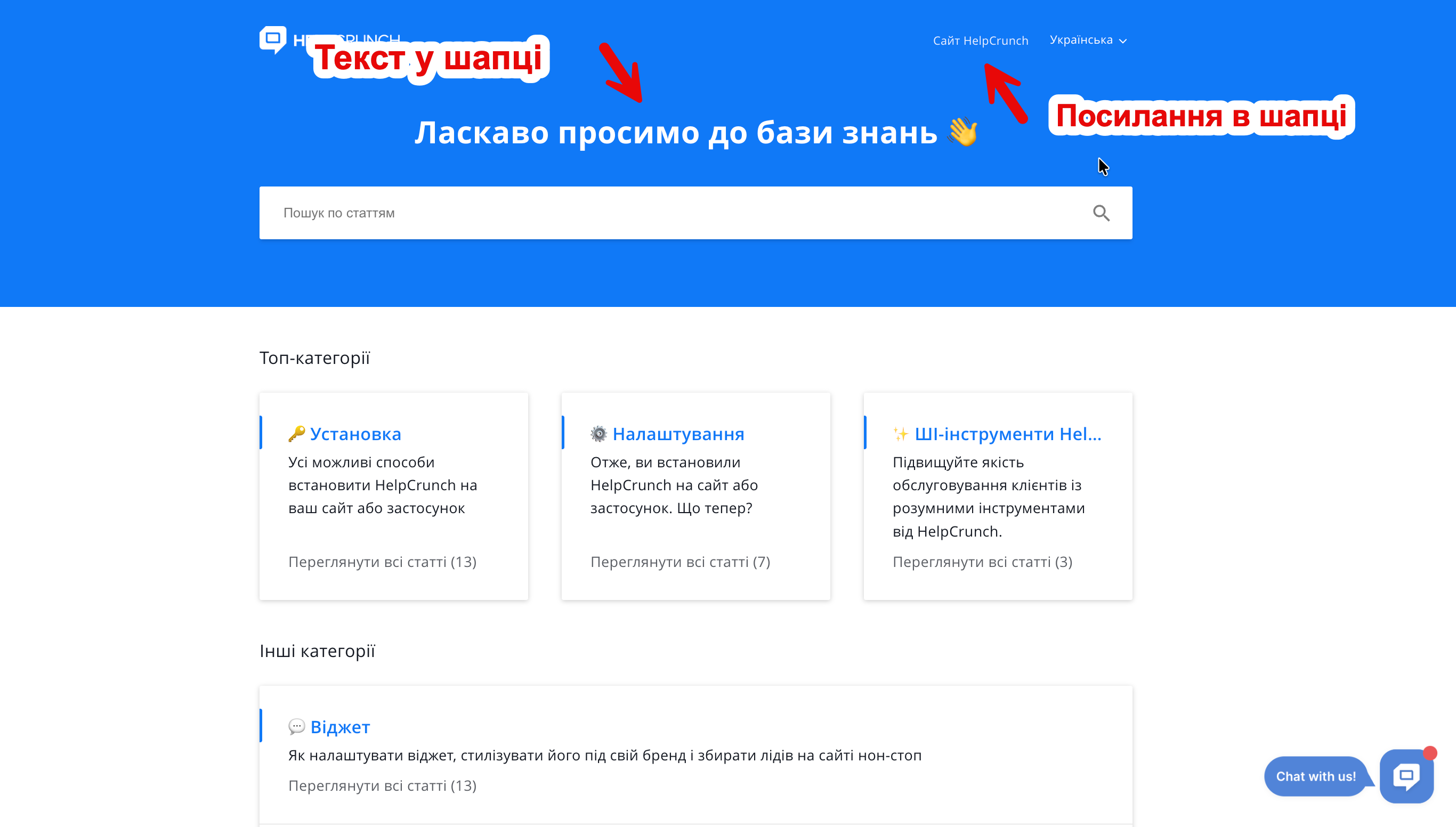 - У віджеті чату HelpCrunch, коли Базу знань відкрито через віджет: