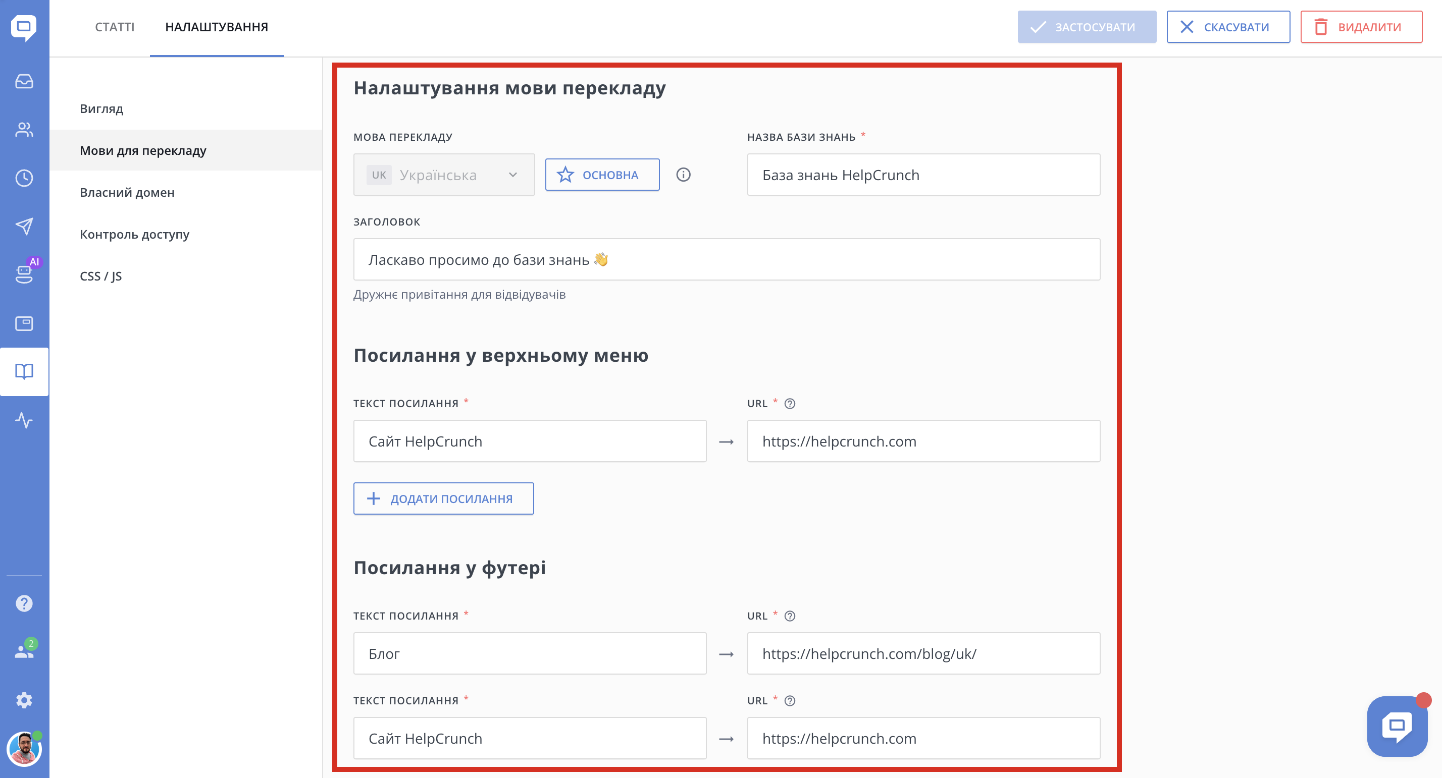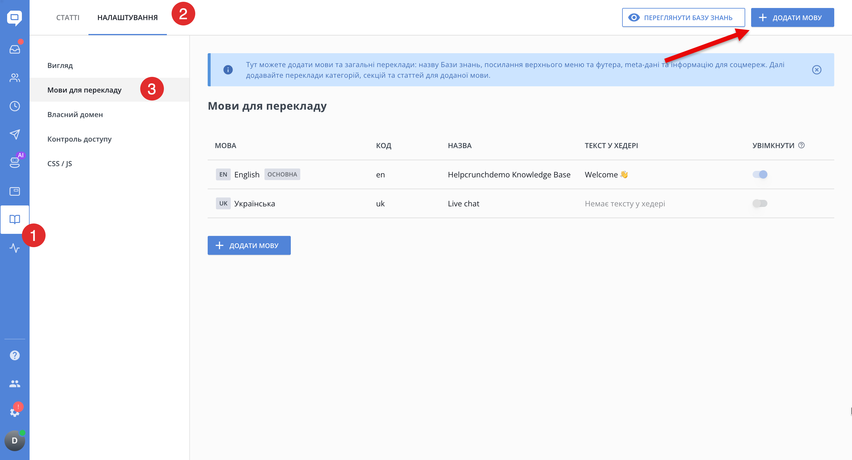 - Перейдіть у База знань → Налаштування → Мови для перекладу.