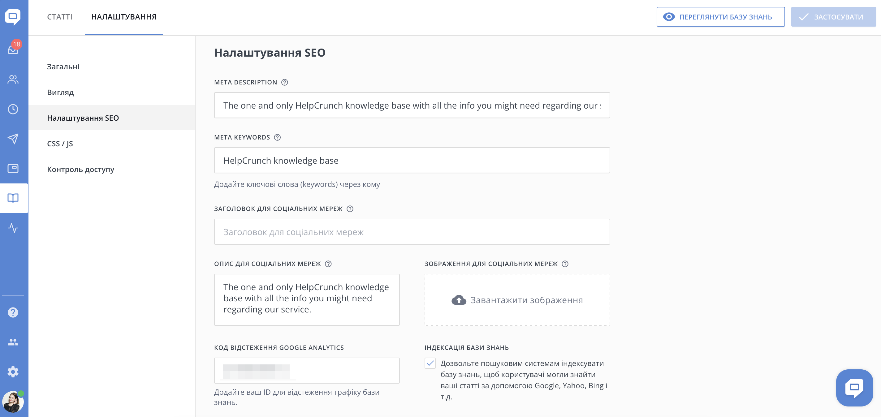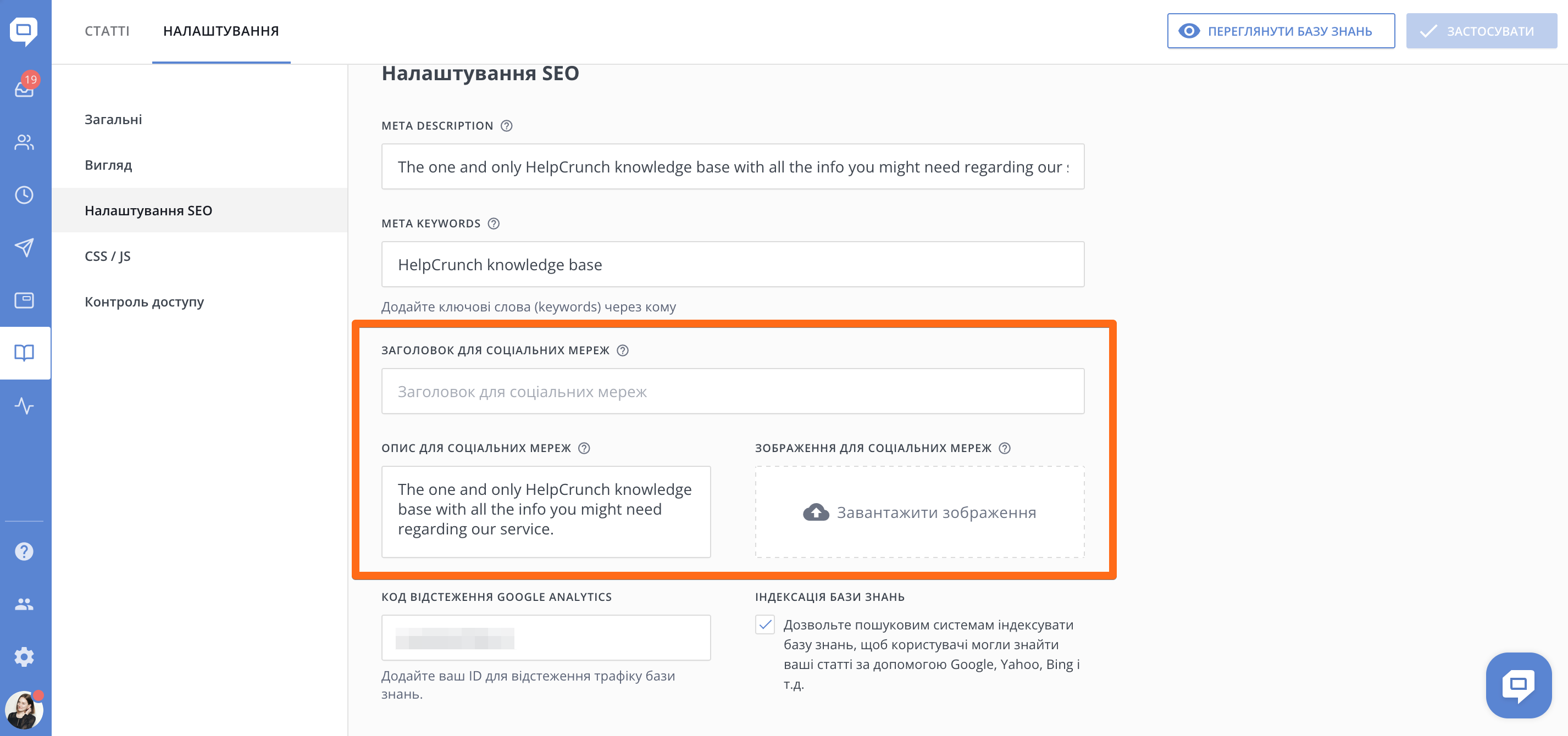 Якщо ви перейдіть у Базу знань → Налаштування → Налаштування SEO, ви побачите налаштування SEO та соціальних мереж для всієї вашої бази знань.