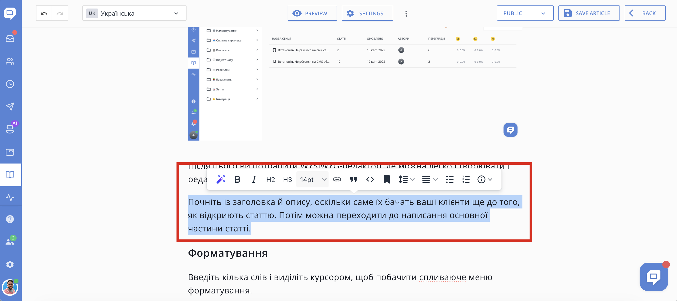 Після цього ви потрапити WYSIWYG-редактор, де можна легко створювати і редагувати статті бази знань.