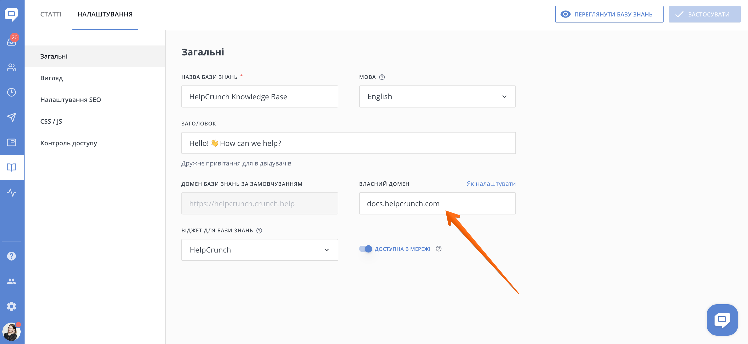 Відразу після того, як ви активували свою базу знань, її домен за замовчуванням доступний через домен [organization].crunch.help — напр. helpcrunch.crunch.help. Але ви можете встановити свій власний домен в три кроки: