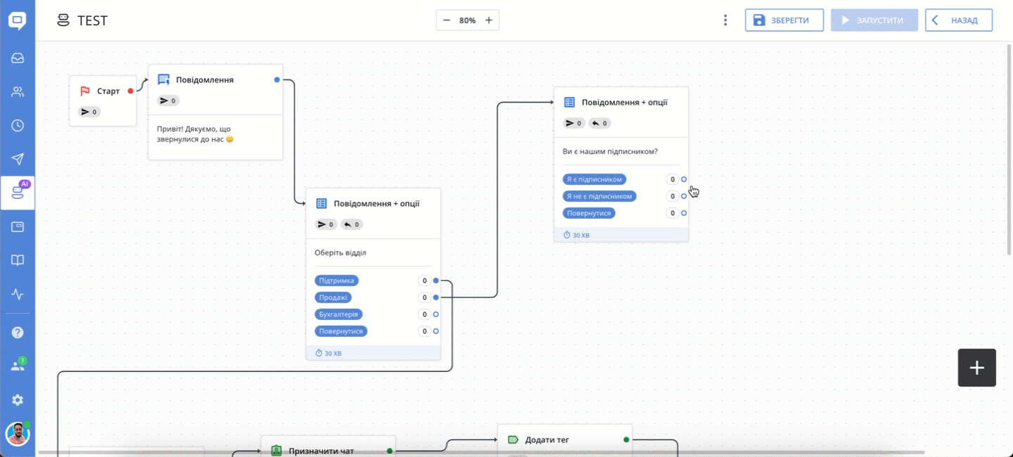 Повiдомлення + опції - дозволяє додати до 8 варіантів для вибору користувачем. Кожен варіант створює окрему гілку у вашому сценарії.