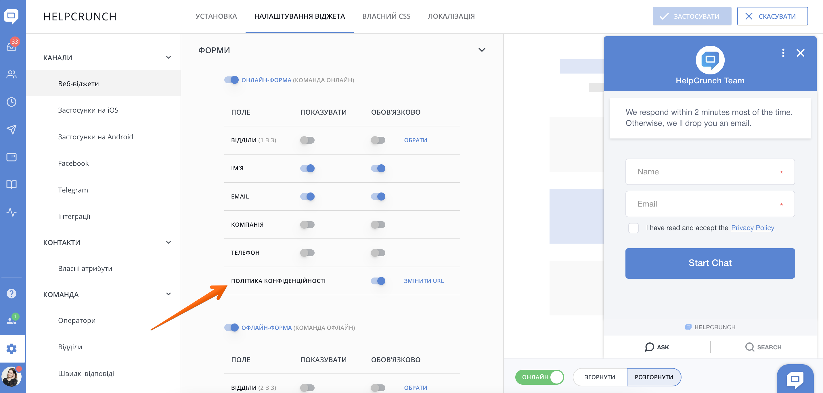 Щоб увімкнути опцію GDPR, просто перейдіть у Налаштування → Канали → Веб-віджети → [Ваш віджет] і оберіть вкладку "Налаштування віджета". У розділі "Форми" ви можете додати посилання на вашу політику конфіденційності і зробити обов'язковим її прийняття перед чатом.