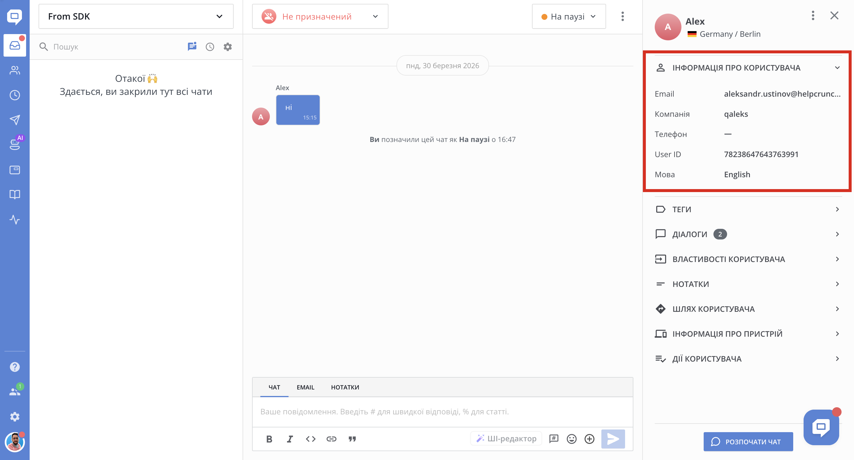 Після додавання даних користувача вони з’являться на панелі адміністратора HelpCrunch з правого боку у вікні чату: