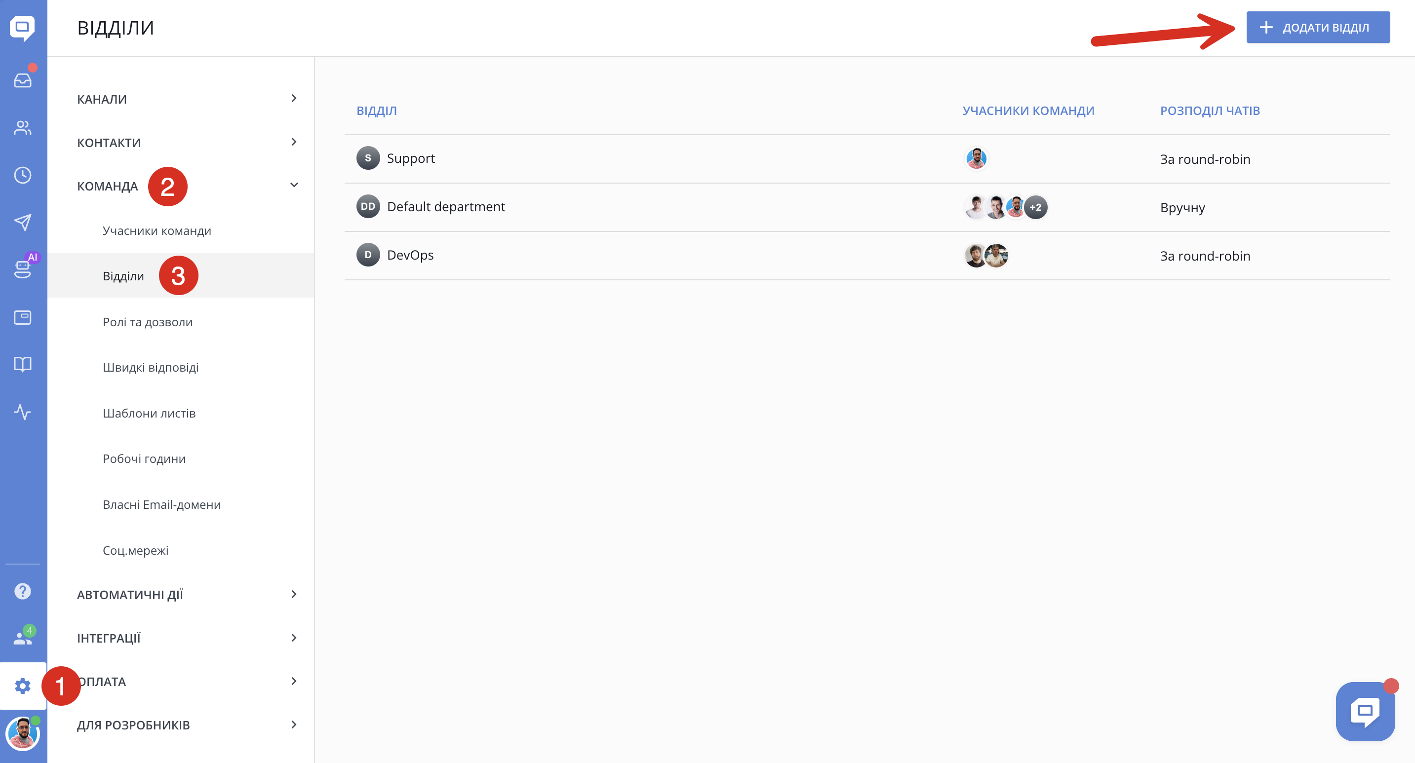 Основна мета створення відділів в тому, щоб ви могли легко призначати чати на різні відділи та відповідно розподіляти запити.