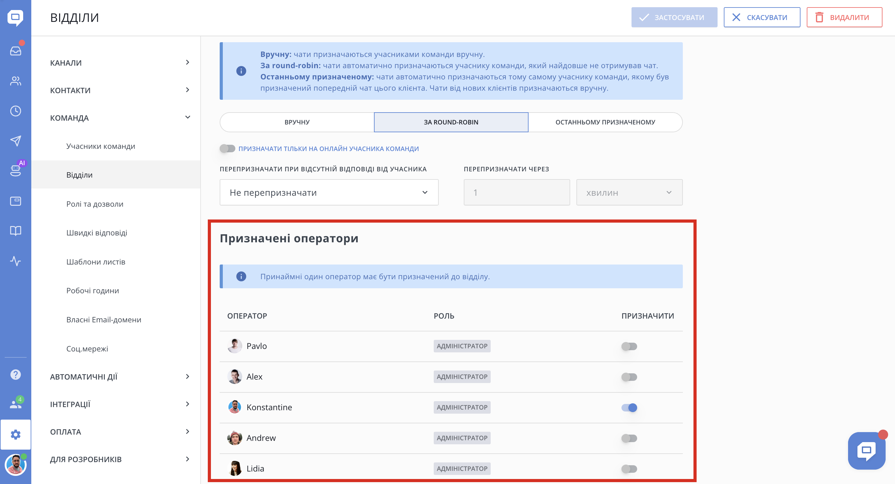 Призначайте чати на певний відділ