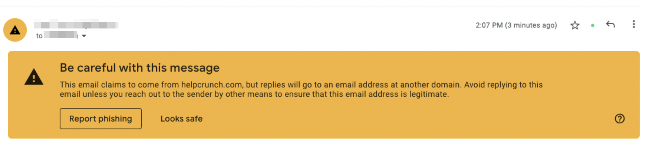 Ви обрали “Вхідні HelpCrunch” у полі “Отримати відповідь”. В цьому випадку алектронні адреси, від кого прийшов лист та куди надсилати відповідь, відрізняються. Такий лист не попадає в спам, але інколи трапляється, що Gmail показує отримувачу таке попередження.