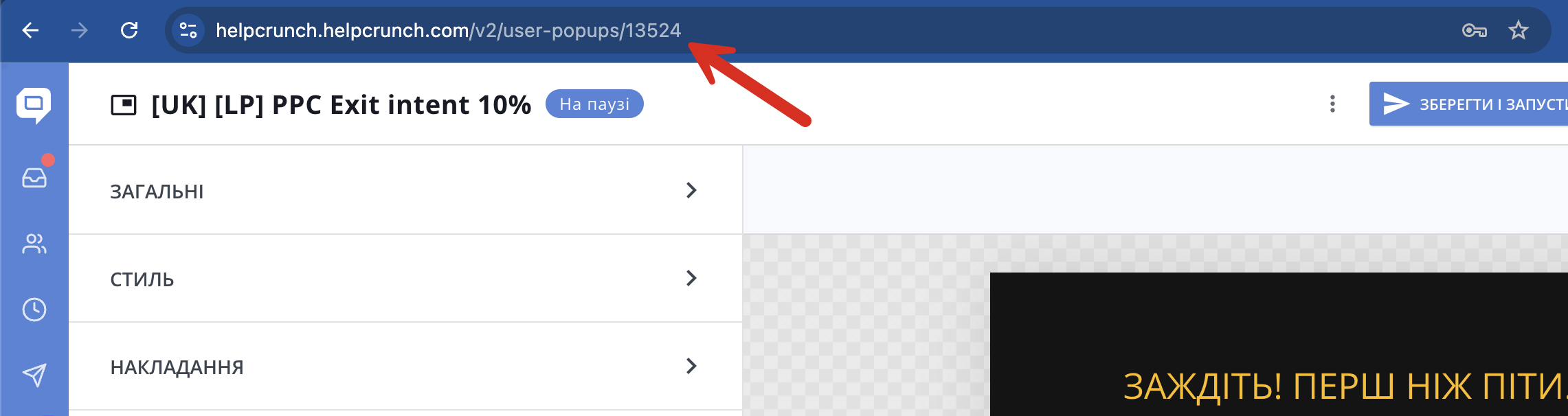 Далі вам потрібно знати ID попапа. Його можна знайти в URL сторінки у вашій панелі HelpCrunch.