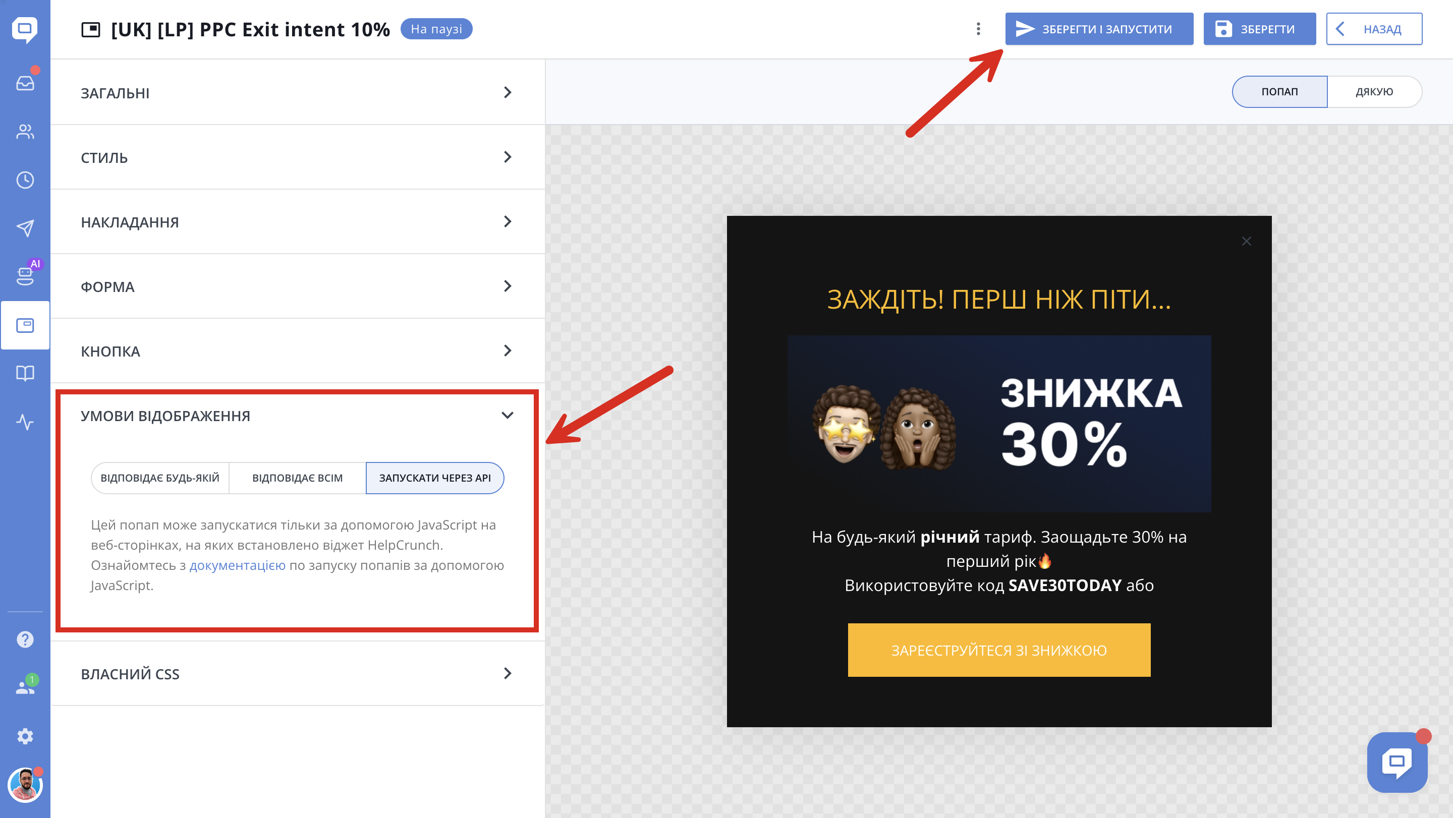 В умовах відображення попапа внизу виберіть опцію "Запускати через API" .