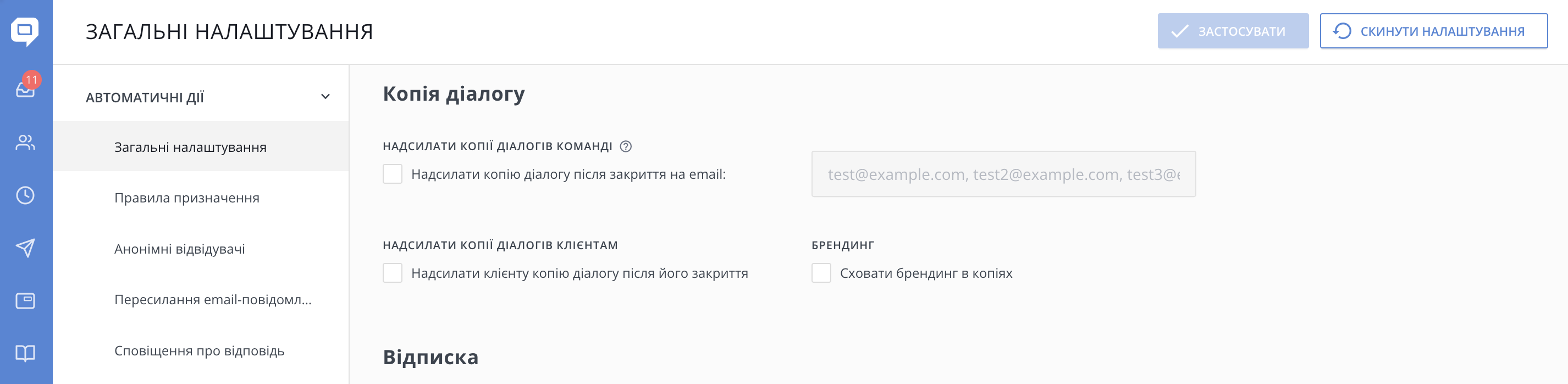 3. Автоматично надсилати копії діалогів на вказані адреси електронної пошти після закриття. Це налаштування можна ввімкнути в Налаштування → Автоматичні дії → Загальні налаштування.