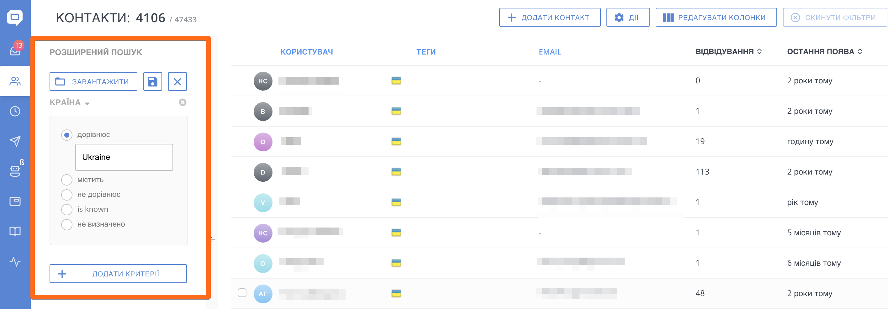 Розділ «Контакти» містить усіх ваших клієнтів і лідів. Щоб знайти що-небудь у базі користувачів, ви можете використовувати різні розширені критерії пошуку. Для цього натисніть кнопку «Додати критерії» на лівій бічній панелі та виберіть потрібний критерій зі списку.