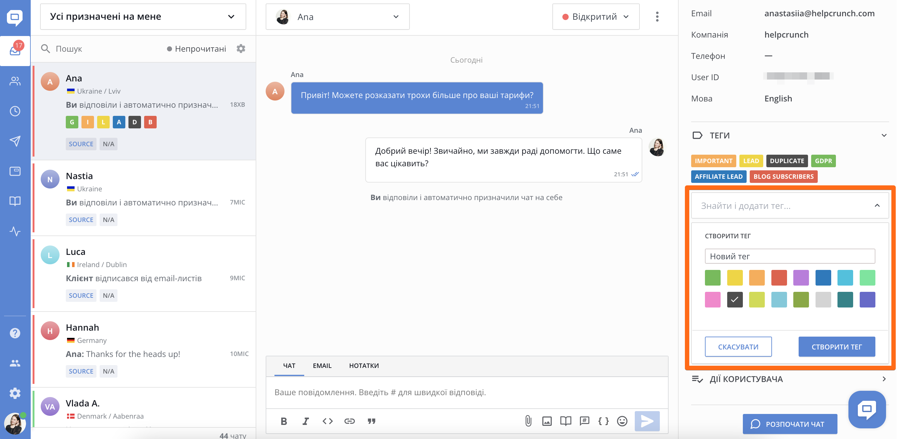 У HelpCrunch ви можете створювати власні теги — наприклад, лід, важливий, демо, фоллоуап, баг, тощо. Теги відображатимуться у бічній панелі діалогу в розділі «Теги» і допоможуть вам швидше зрозуміти та визначити пріоритети для кожного запиту.