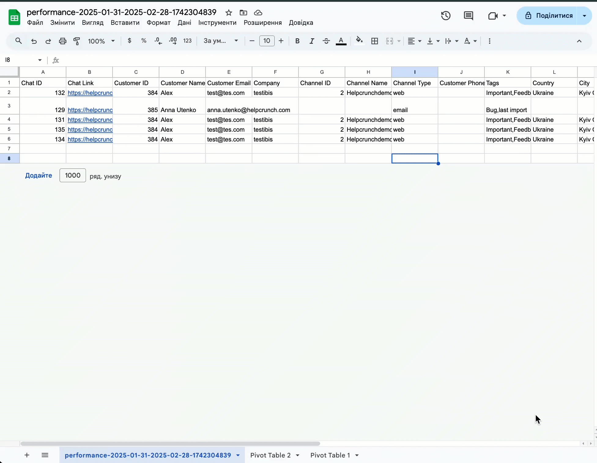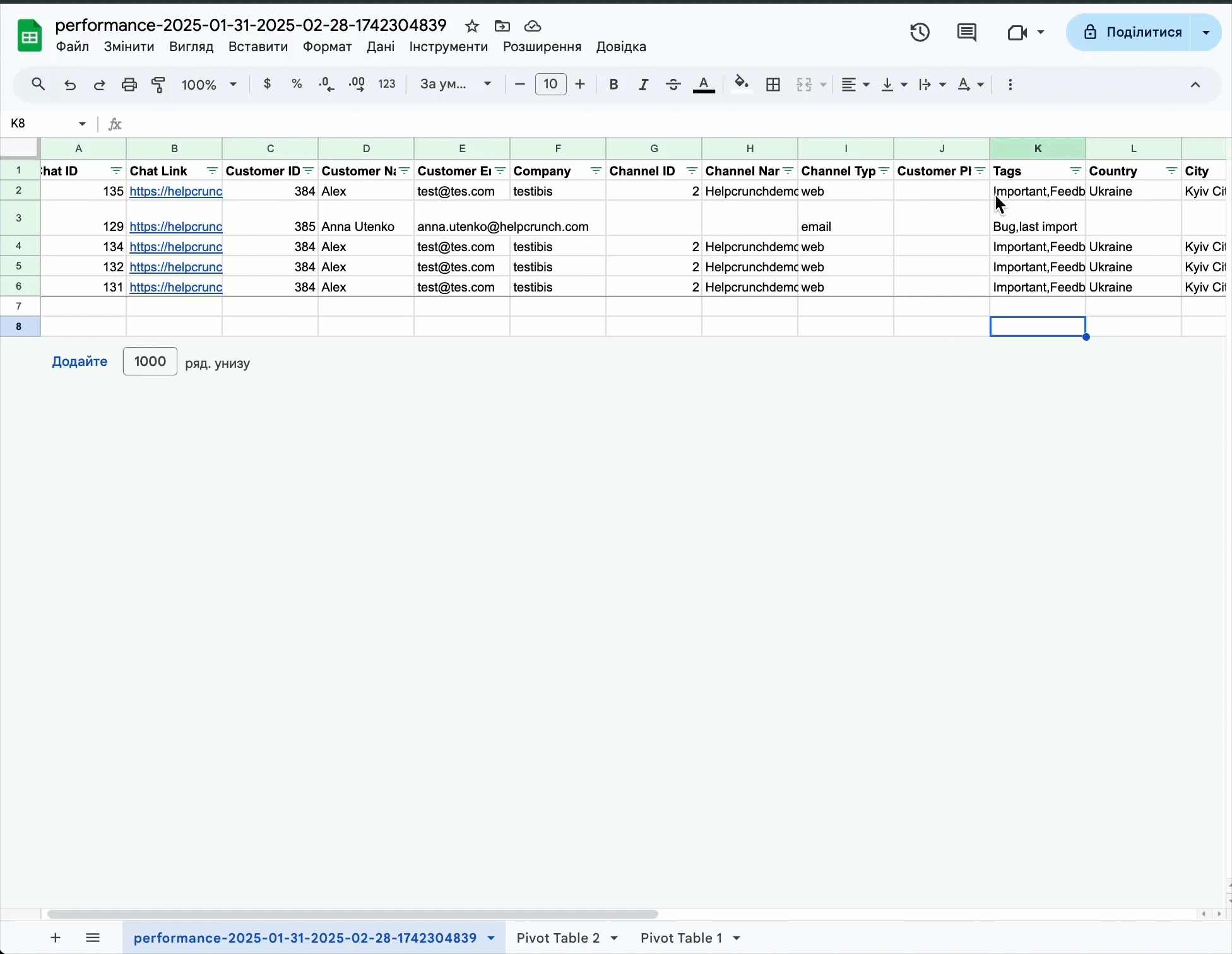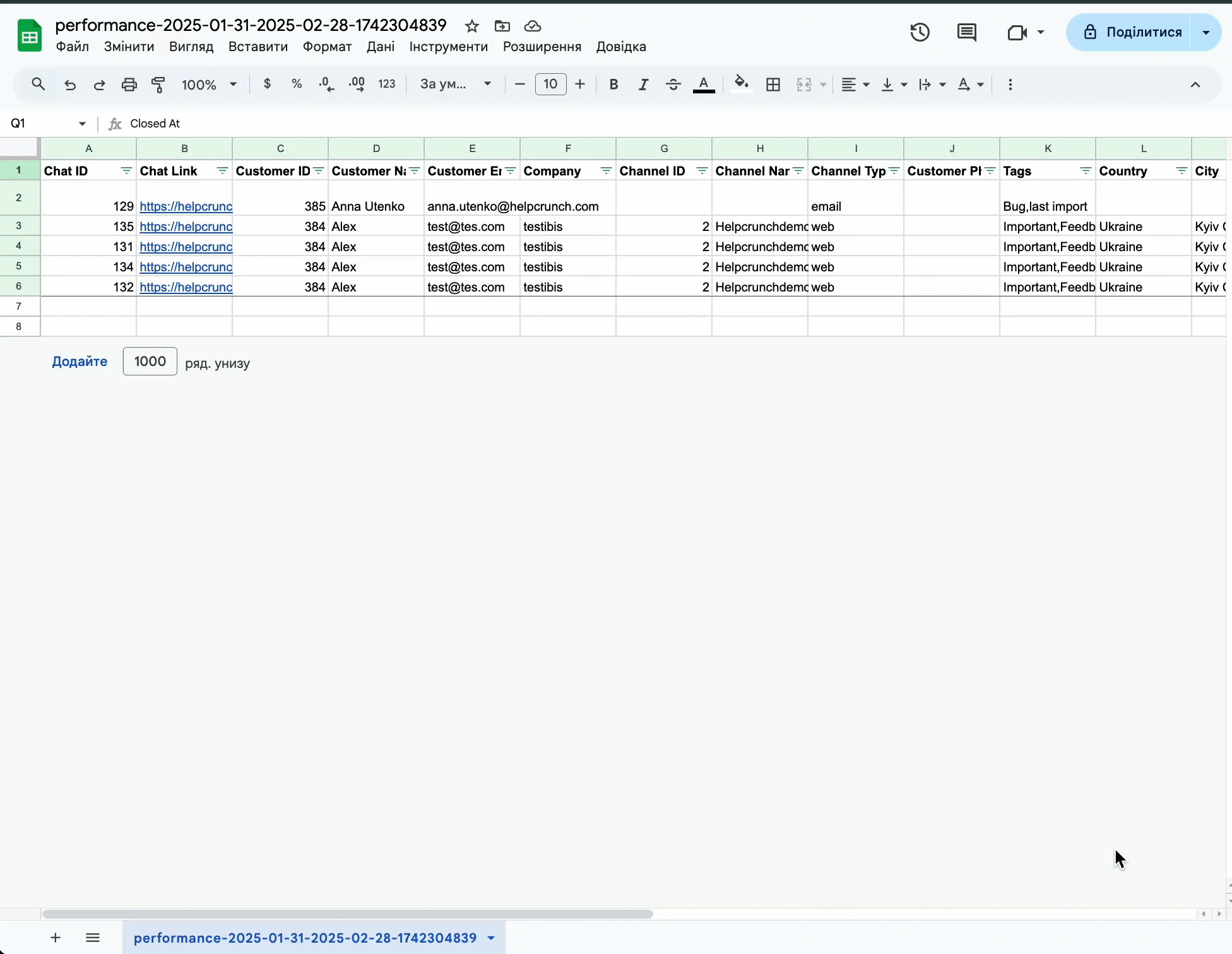 Ви можете експортувати звіти HelpCrunch у форматі CSV або Excel і аналізувати їх у будь-якому інструменті для роботи з електронними таблицями.