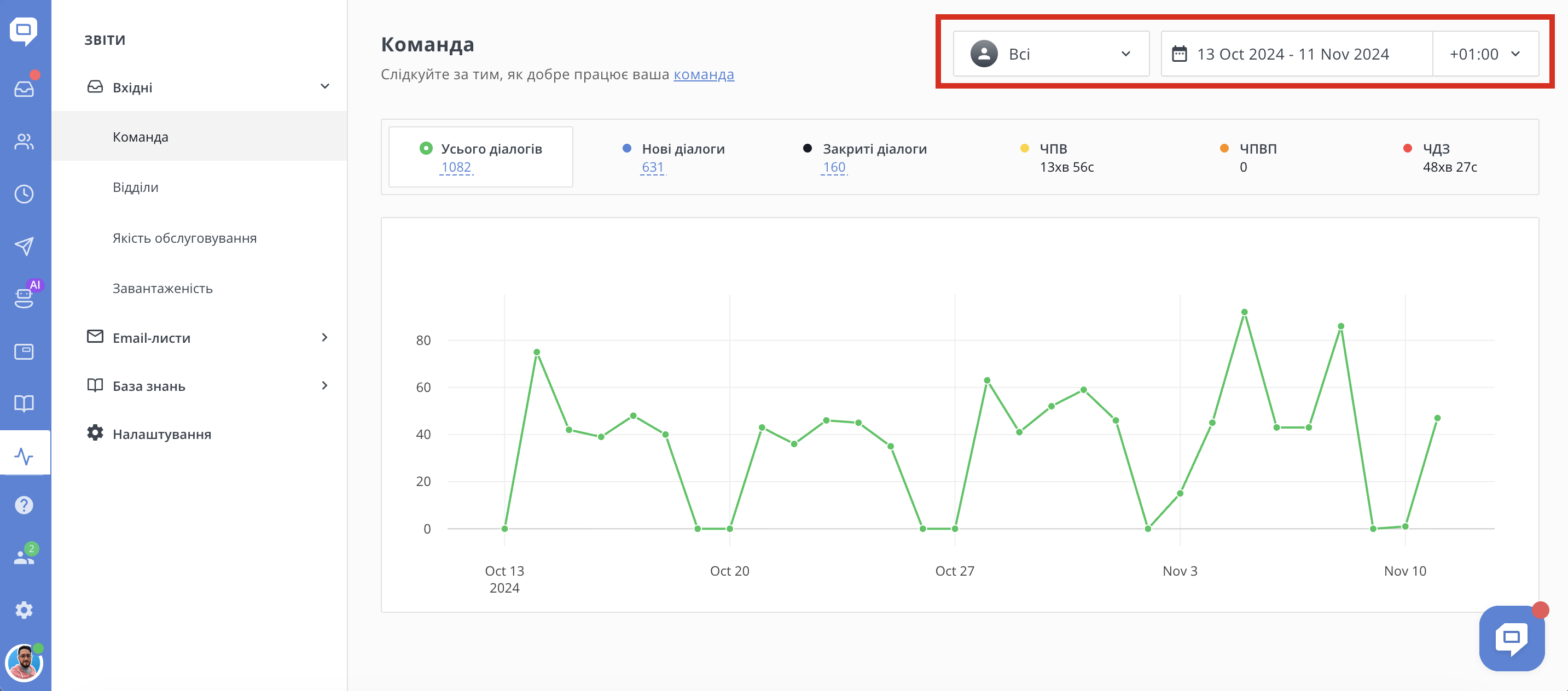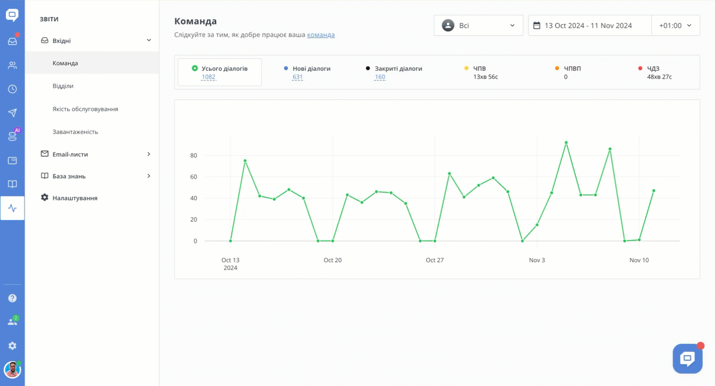 - Усього діалогів – Загальна кількість діалогів за вказаний період. Рахуються діалоги, в яких була принаймні одна відповідь від вашої команди і хоча б одне повідомлення від клієнта.